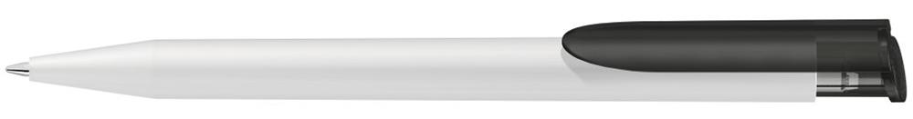 Retractable ballpoint pen with white barrel and colored frosted clip.