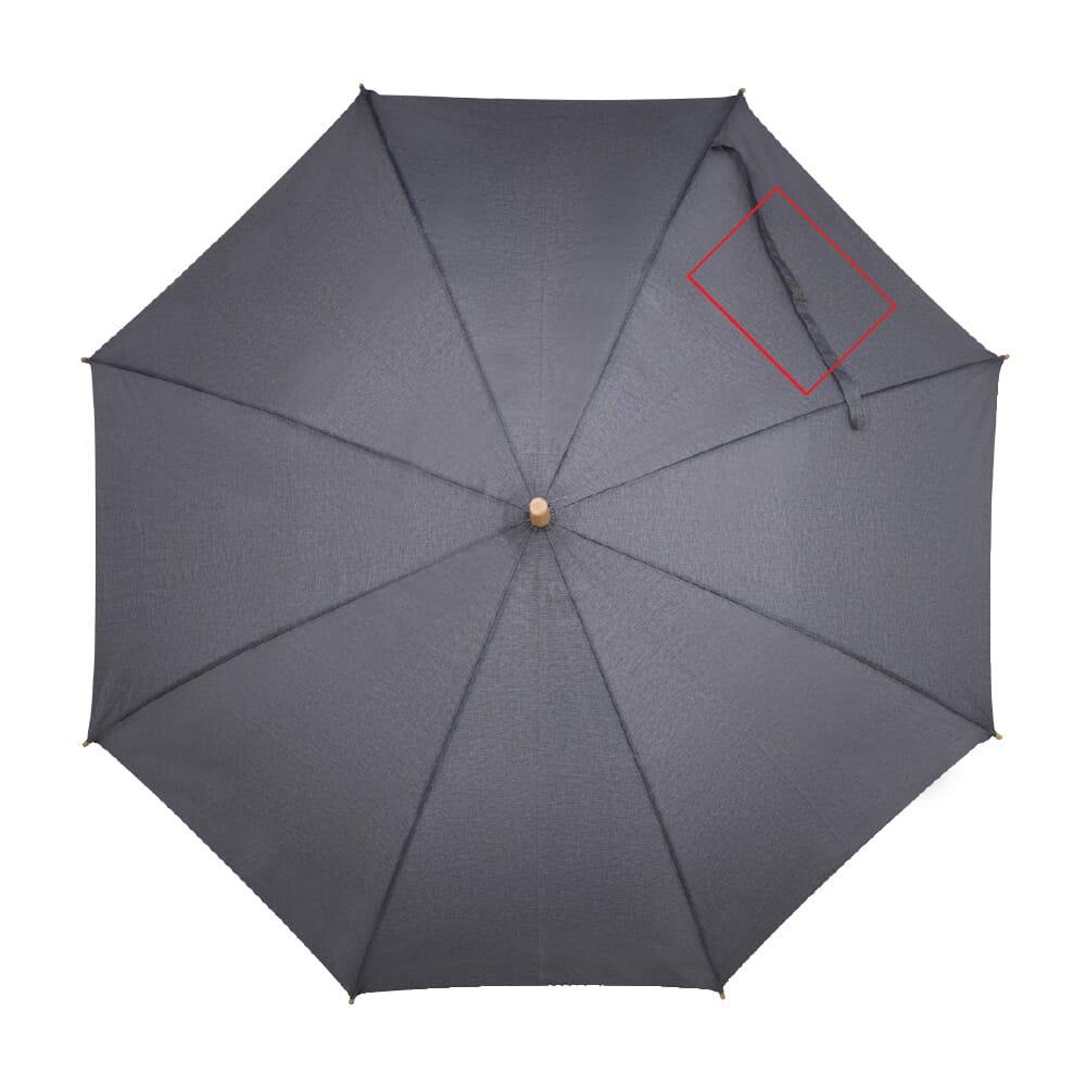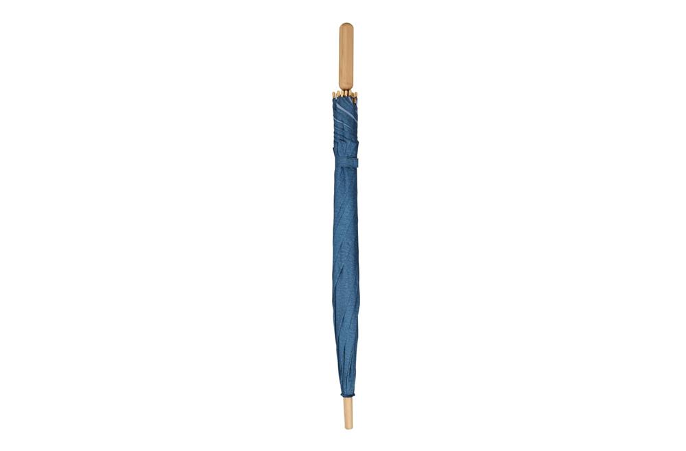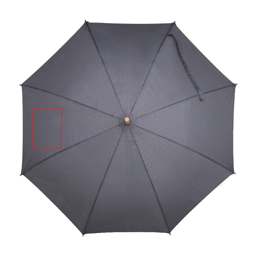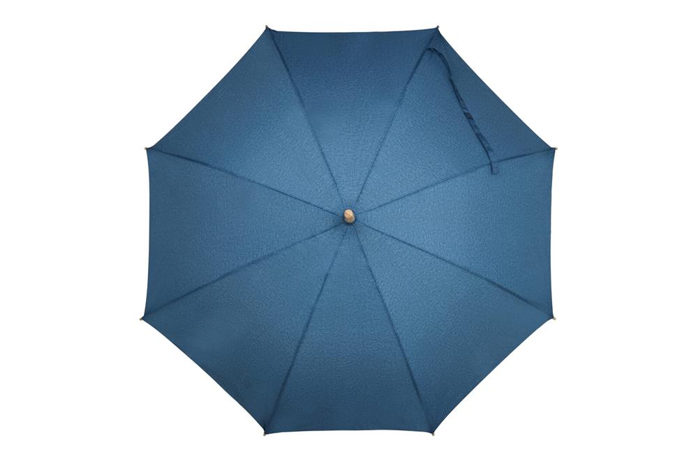 Stockschirm aus R-PET-Material mit einem eleganten Holzgriff. Durch den stabilen Fiberglasrahmen ist der Schirm sturmsicher. Die Spitzen sind aus Bambus und der Schaft aus Metall, somit können alle Elemente recycelt werden. Das melierte Material verleiht dem Modell einen luxuriösen Look.