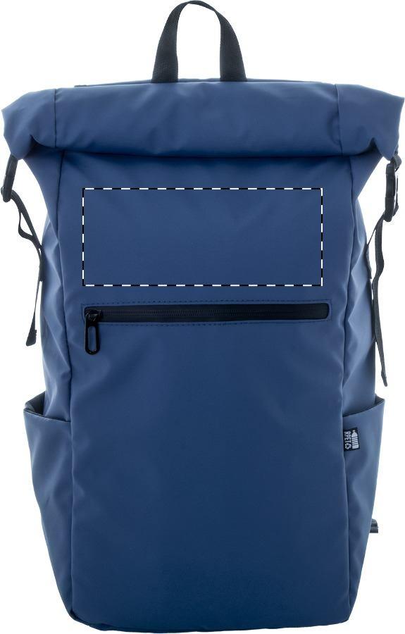 Wasserdichter Rolltop-Rucksack aus RPET mit Schnalle und Klettverschluss, gepolstertem Laptop- (16") und Tabletfach (10"), Reißverschlusstasche vorne, Seitentaschen, gepolstertem Rücken und Schultergurten. Material: PU beschichtetes 600D RPET-Polyester. Mit RPET-Label.