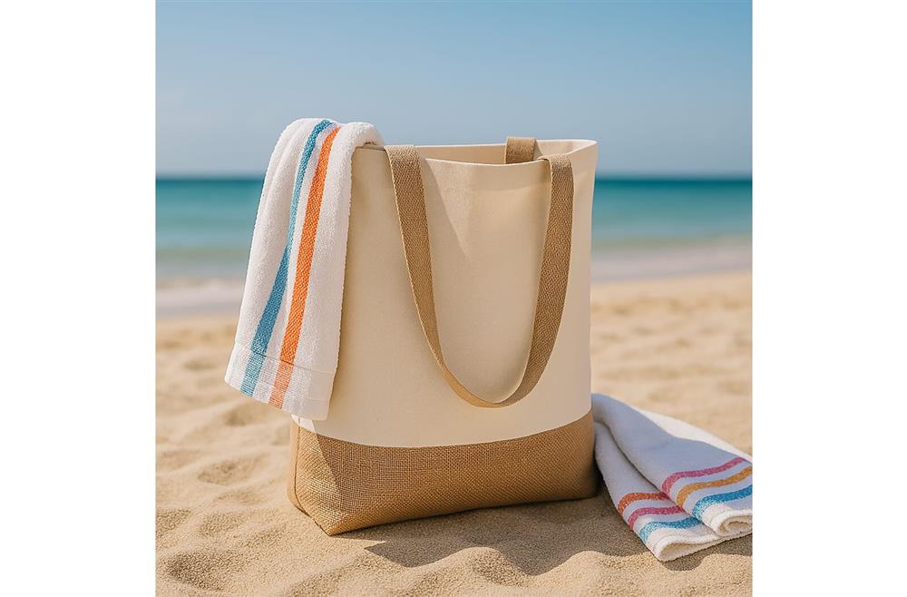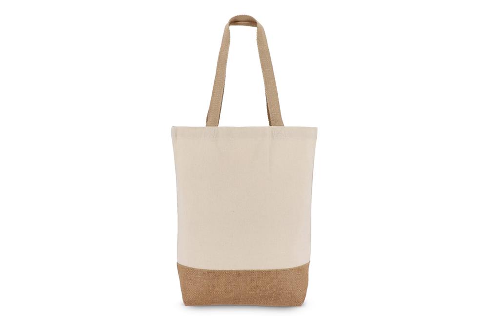 Strapazierfähige Tasche mit Vorder- und Rückwand aus Baumwoll-Canvas und Bodenfalte aus Jute - alles 320 g/m². Oeko-Tex® zertifiziert für sichere, geprüfte Materialien. Eine praktische und stilvolle Option für den Einzelhandel, Veranstaltungen oder den täglichen Gebrauch.