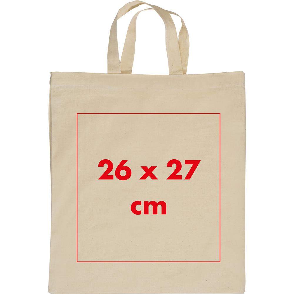 Oeko-Tex® STANDARD 100 zertifizierte, naturfarbene Baumwolltasche (140g/m²) mit zwei kurzen Henkeln. Ihre Werbung drucken wir auf eine Seite der Tasche.