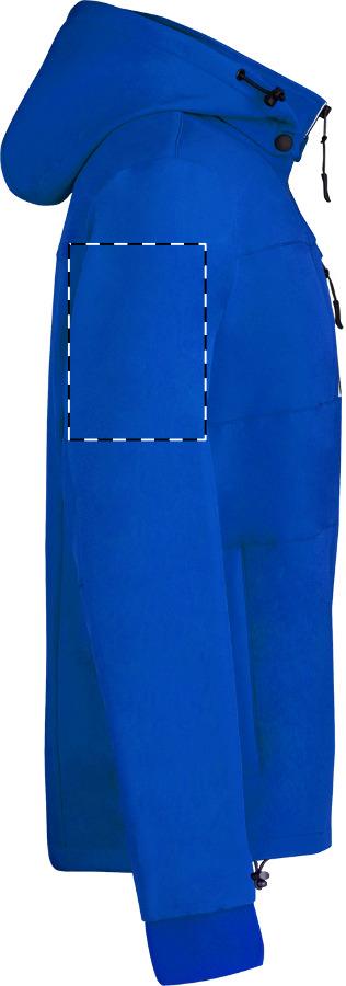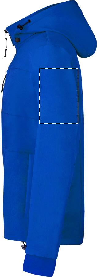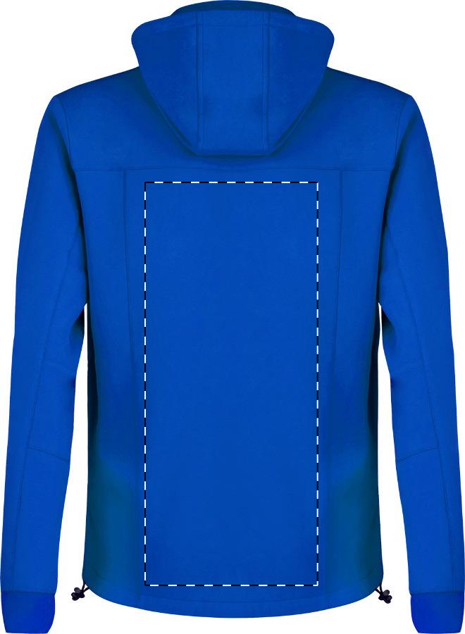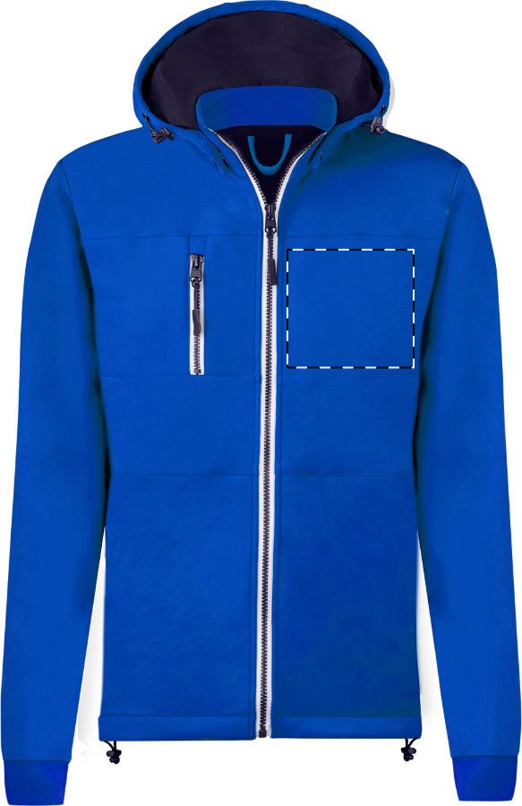 Wind- und wasserfeste Softshell-Jacke mit Reißverschluss, 2 Seitentaschen, 1 Vordertasche, Stehkragen und abnehbarer Kapuze. Material: 100% Polyester, 300g/m².