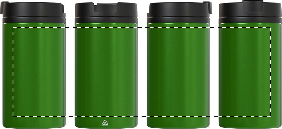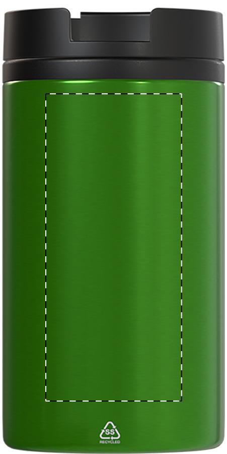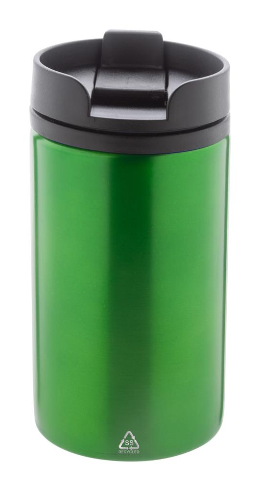 Doppelwandiger, isolierter Thermobecher aus recyceltem Edelstahl mit Innenseite aus PP-Kunststoff und Trinkdeckel. Füllmenge: 250 ml.
