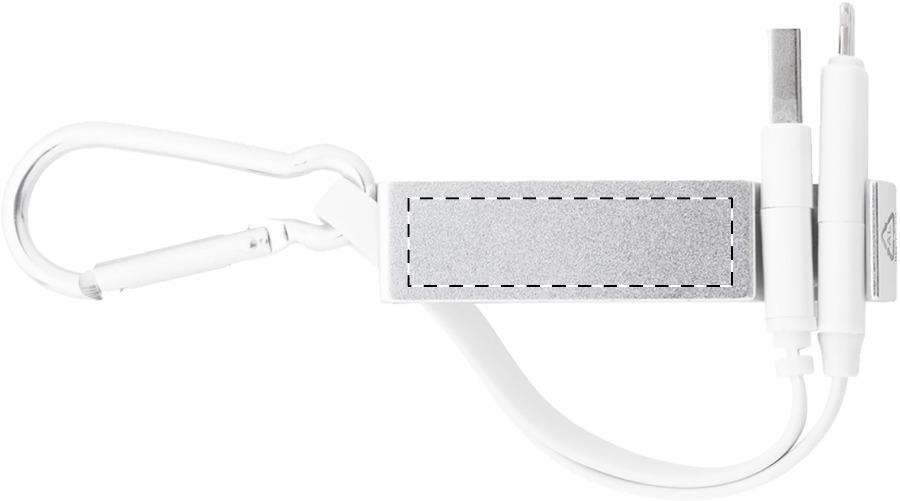 USB-Ladekabel mit Karabiner aus recyceltem Aluminium und Handyhalter mit Flaschenöffnerfunktion. Mit Micro-USB-, USB-C- und Lightning-Anschlüssen. Mit USB- und USB-C-Eingängen.