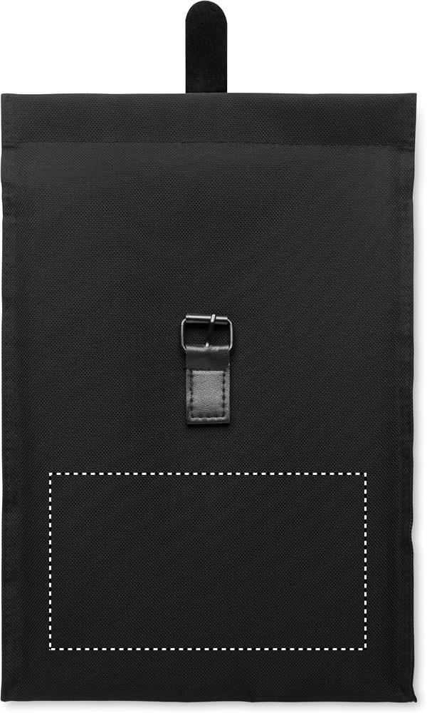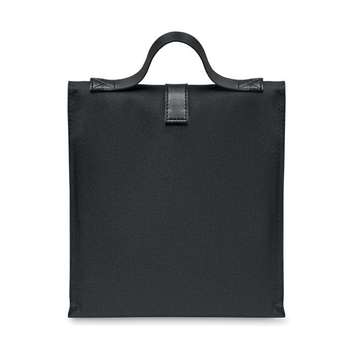 Lunch-Kühltasche aus 600D RPET-Polyester mit Rolltop. Tragegriff und Verschluss aus PU. Isolierung: 3mm PE-Schaum mit PEVA.