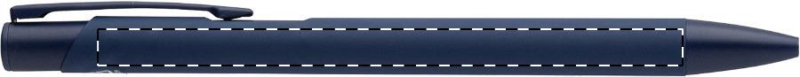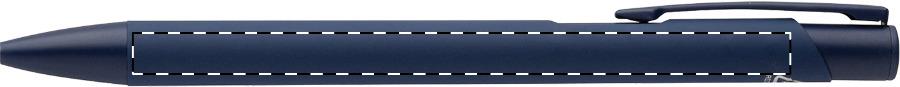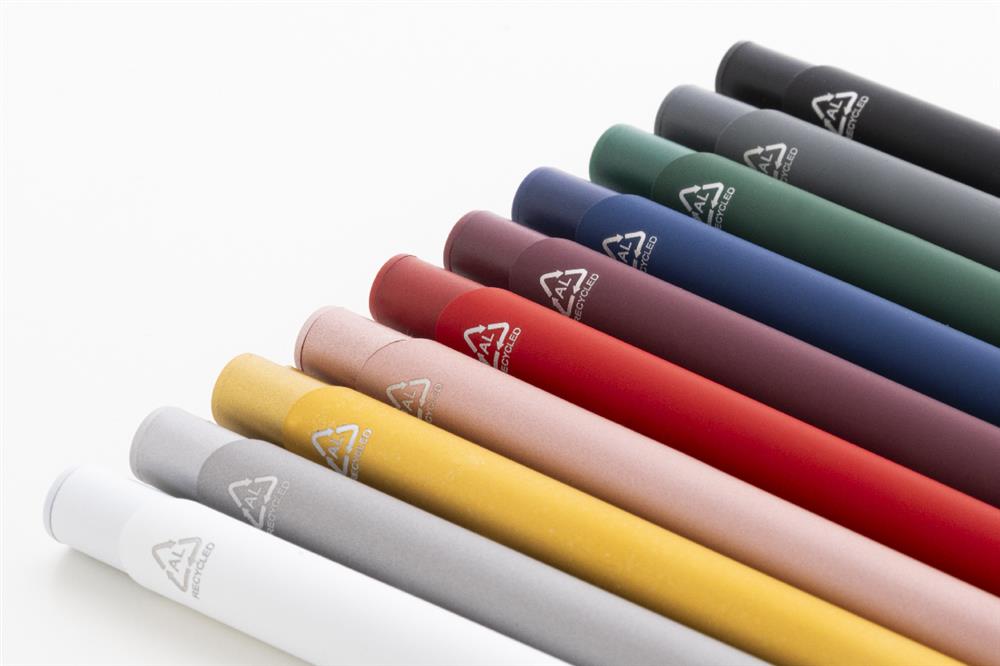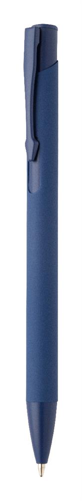 Kugelschreiber aus recyceltem Aluminium mit gummiertem Gehäuse und farblich passenden Details, blauschreibend.