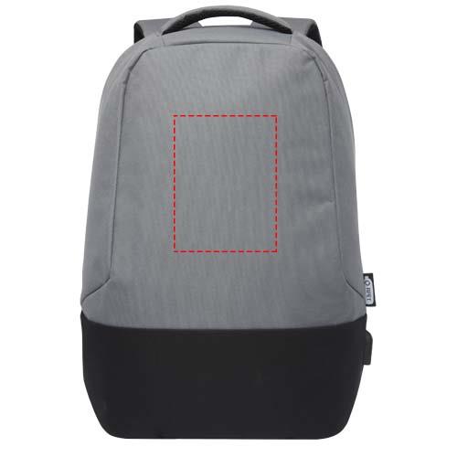 GRS zertifizierter Rucksack, ausgestattet mit einem offenen Hauptfach mit Ordnungsfach, gepolsterter 15" Laptophülle und 2 Taschen mit RFID-Schutz. USB-Port auf der rechten Seite zum einfachen Anschließen und Laden von Geräten aus dem Innenraum. Mit gepolsterten Schultergurten, rechtem Schultergurt, versteckter Reißverschlusstasche, Haltegriff und Trolley-Durchgriff. Für die Herstellung dieser Tasche werden ca. 15 Kunststoffflaschen recycelt.