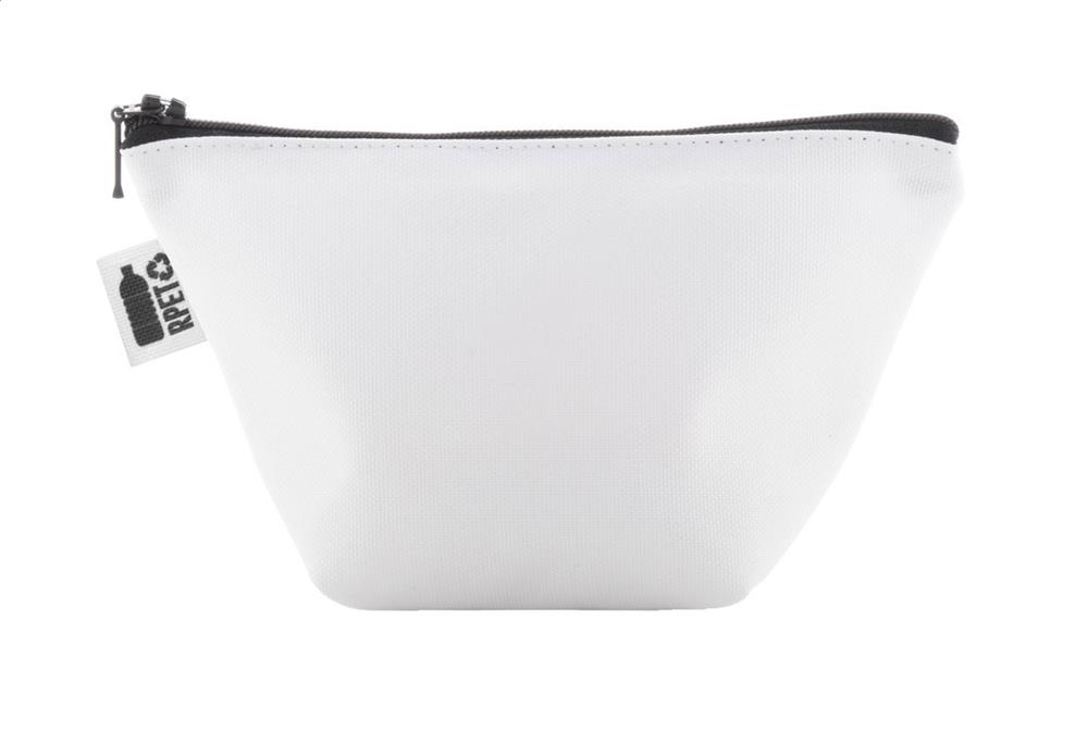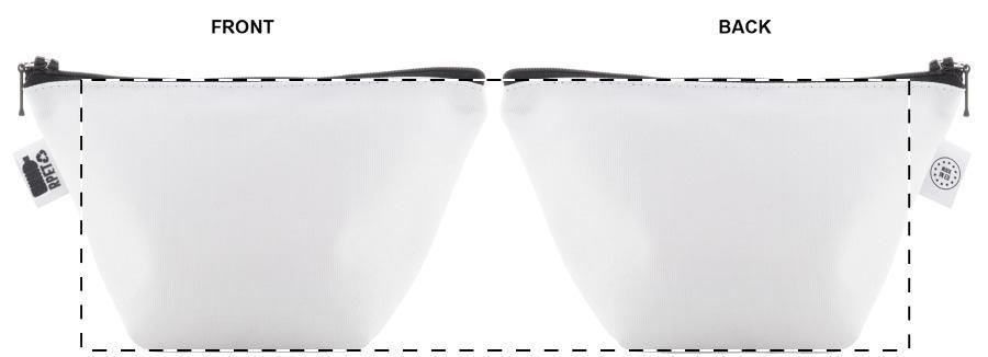 Individuelle Reißverschluss-Kosmetiktasche aus 600D RPET Polyester mit vollflächigem Sublimationsdruck und RPET-Label. Mindestmenge: 50 Stk.