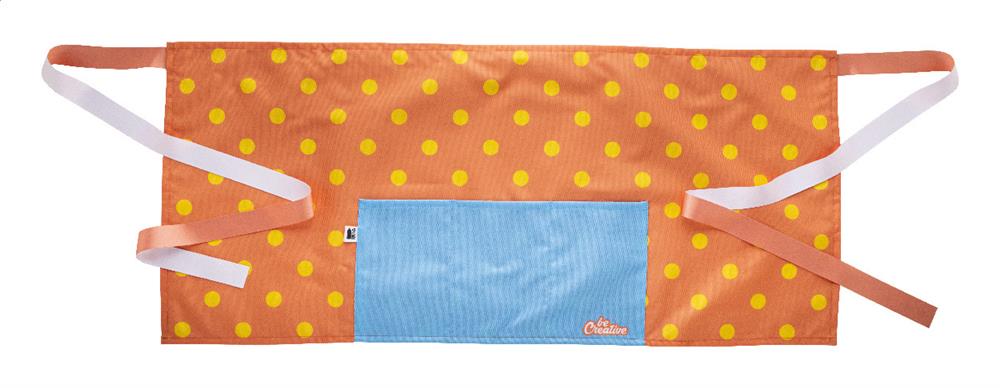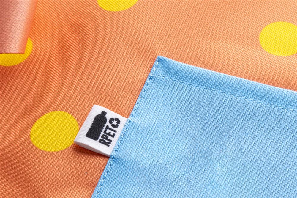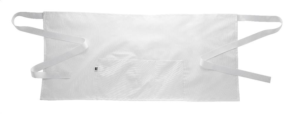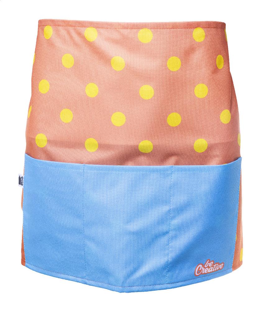 Individuelle Bistro-Schürze aus 600D RPET-Polyester mit dreifacher Fronttasche und vollflächigem Sublimationsdruck. Mindestmenge: 25 Stk. Mit RPET-Label.