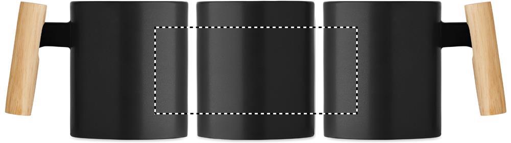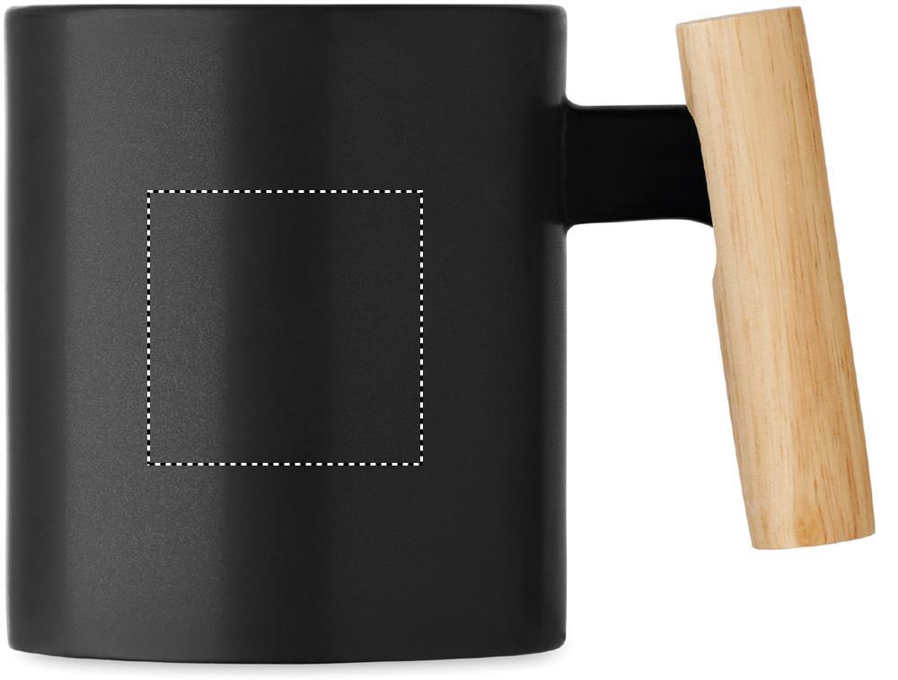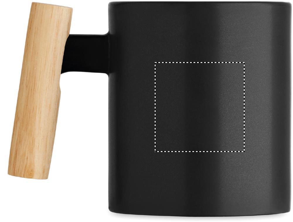 Becher aus Keramik mit Griff aus Holz. Füllmenge: 320 ml. Einzeln verpackt in weißer Schachtel.