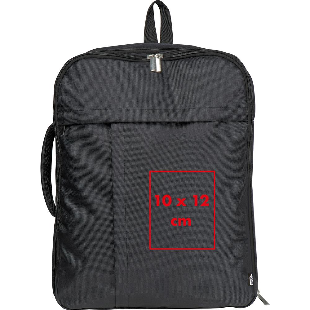 CrisMa Reiserucksack aus RPET mit Laptopfach und großem Vorfach. Durch den Rundumreißverschluss lässt er sich wie ein Koffer packen. Die gepolsterten Schultergurte können in einem Reißverschlussfach verstaut werden und die Tasche lässt sich durch den seitlichen Tragegriff als Tasche verwenden. Ihre Werbung drucken wir auf die Front.
