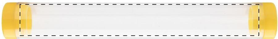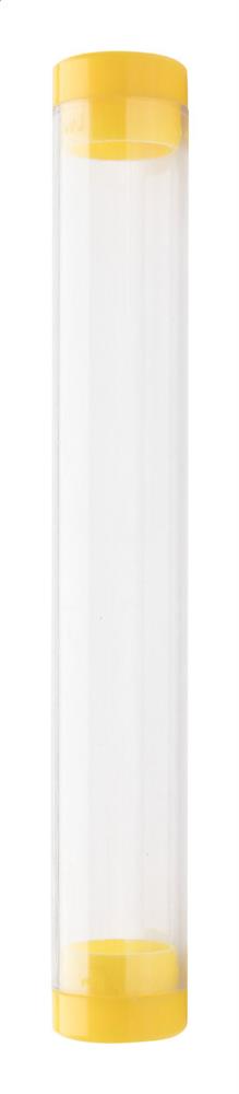Transparentes Etui aus Kunststoff mit farbigen Kappen, für ein Schreibgerät.