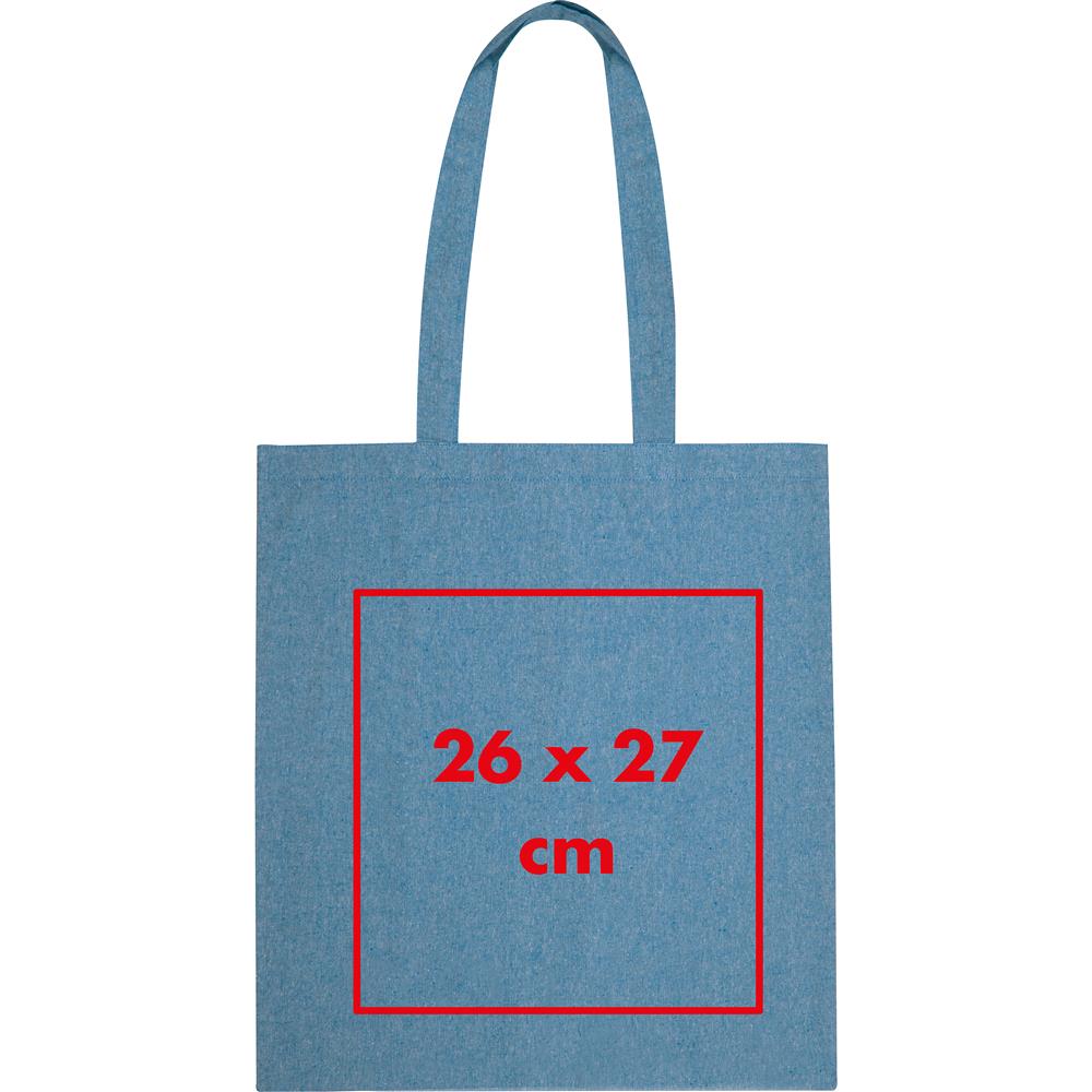 Oeko-Tex® STANDARD 100 zertifizierte Einkaufstasche aus recycelter Baumwolle mit langen Tragehenkeln und einer Grammatur von 140g/m². Die Werbung wird auf eine Seite der Tasche gedruckt.