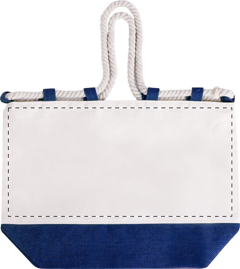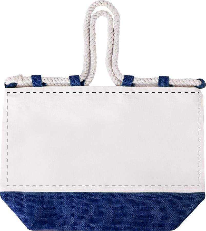 Zweifarbige Strandtasche aus Jute und Baumwolle mit geflochteten Kordelgriffen. 280 g/m².
