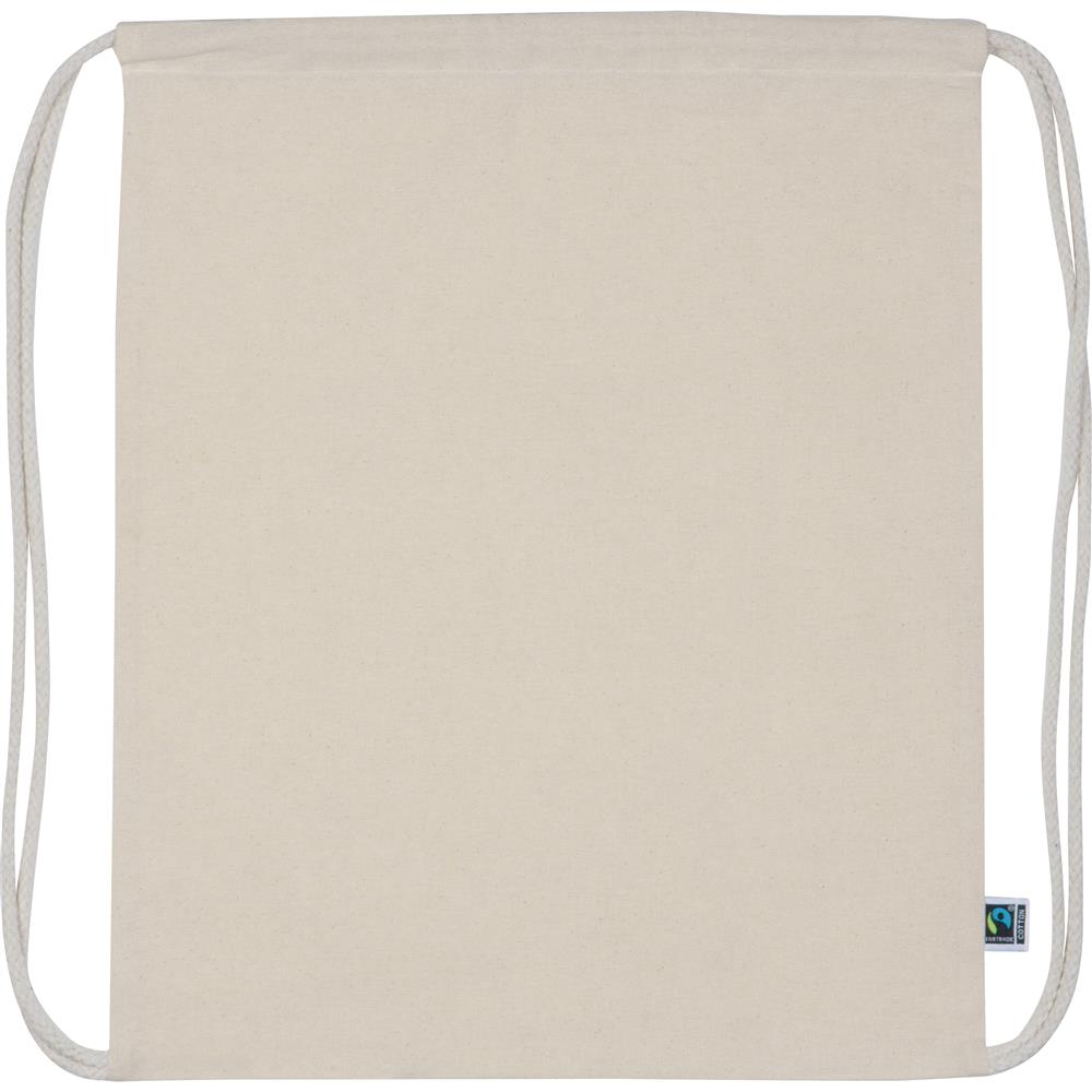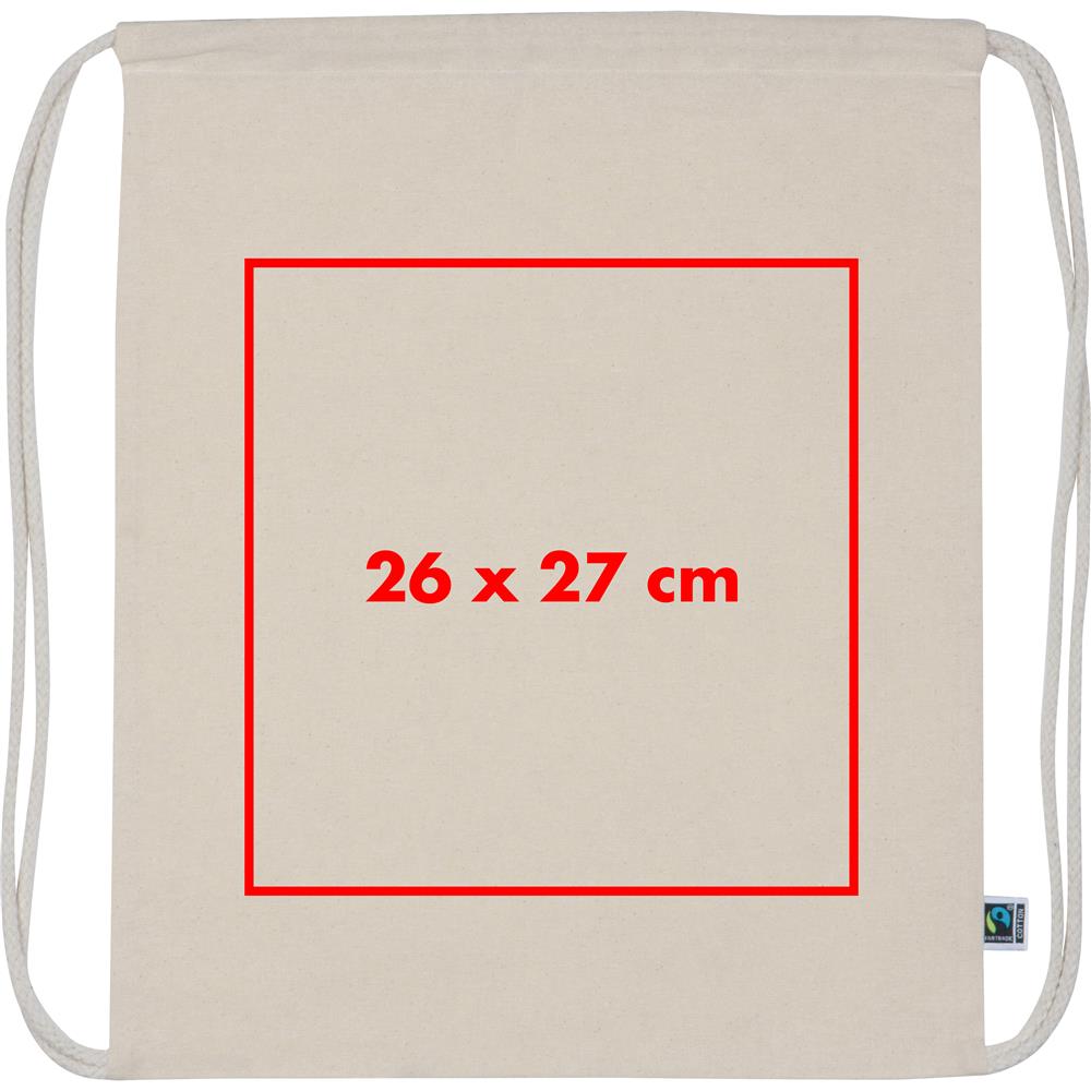 Fairtrade Gymbag aus Baumwolle (180g/m²) mit Fairtrade-Label. Ihre Werbung drucken wir auf eine Seite.
