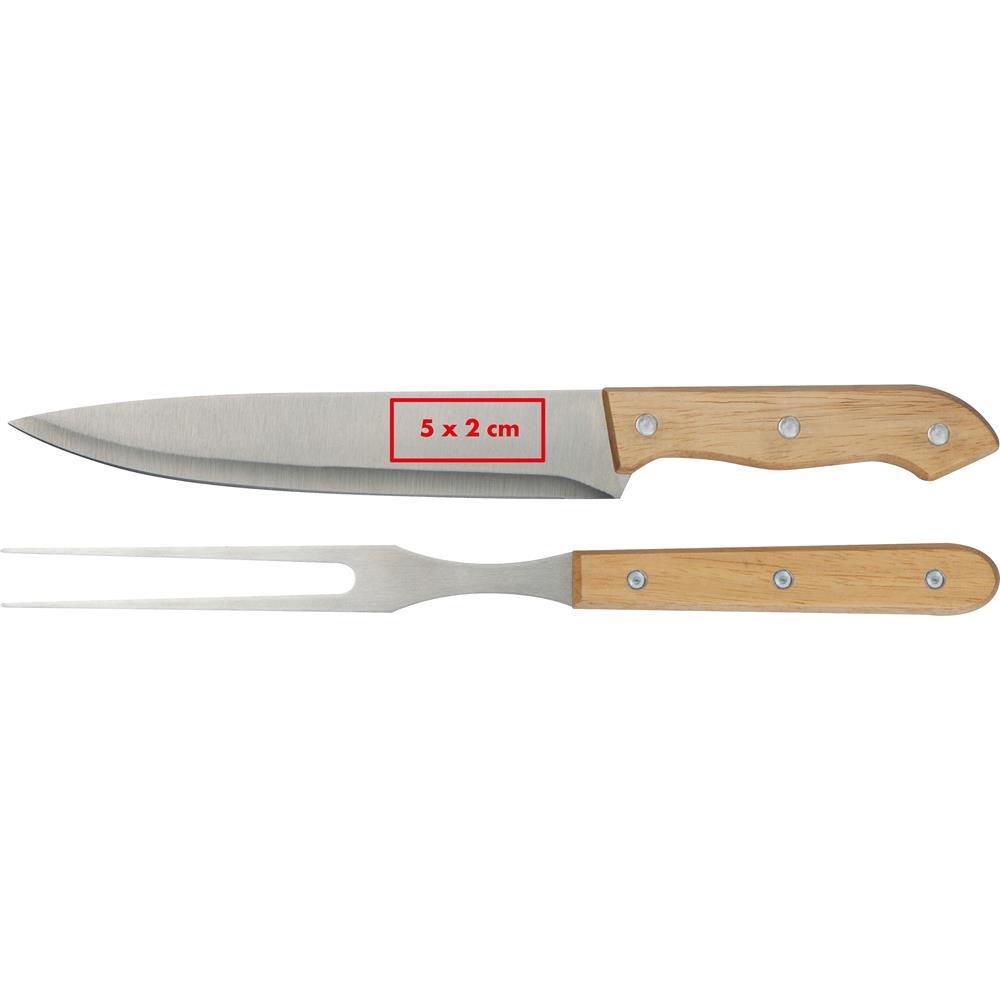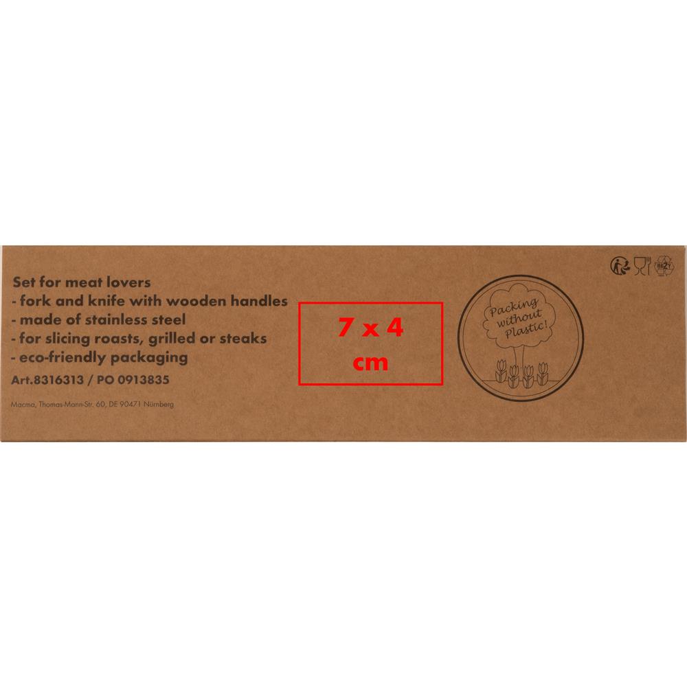 Ein Set für Fleischliebhaber, Gabel und Messer aus Edelstahl mit Holzgriffen zum Aufschneiden von Braten, Gegrilltem oder Steaks in einer Kartonverpackung. Die Werbung wird auf die Klinge graviert.