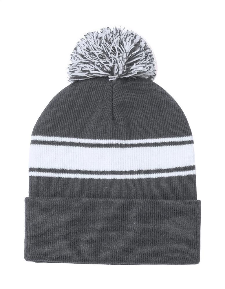 Wintermütze mit Bommel und weißen Streifen, Material: Acryl.