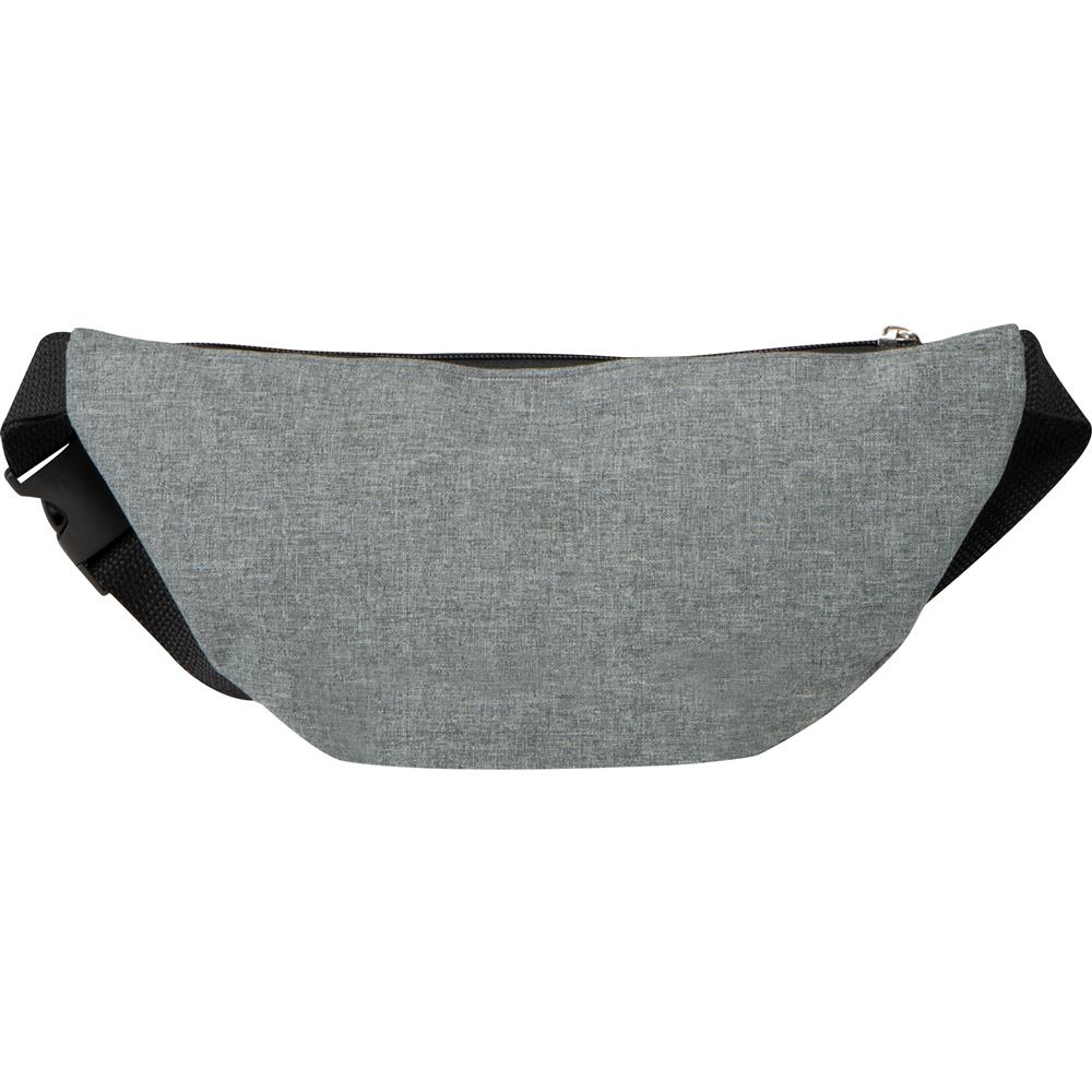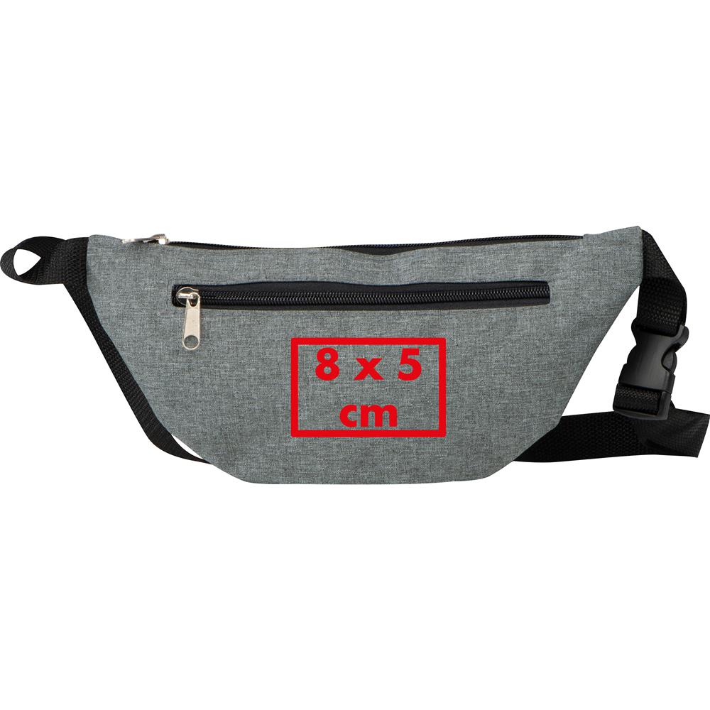 Einfache Gürteltasche aus Snow Polyester mit verstellbarem Gurt, einem Haupt- und einem Vorfach. Ihre Werbung wird unterhalb des Reißverschlusses gedruckt.