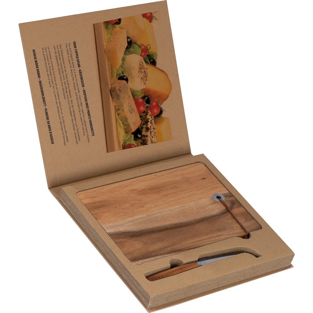 Käseset in einer Kartonverpackung, bestehend aus einem Holzbrett mit Aufhänger aus Leder und einem Käsemesser aus Edelstahl. Die Werbung wird mittels Lasergravur auf dem Brett angebracht.