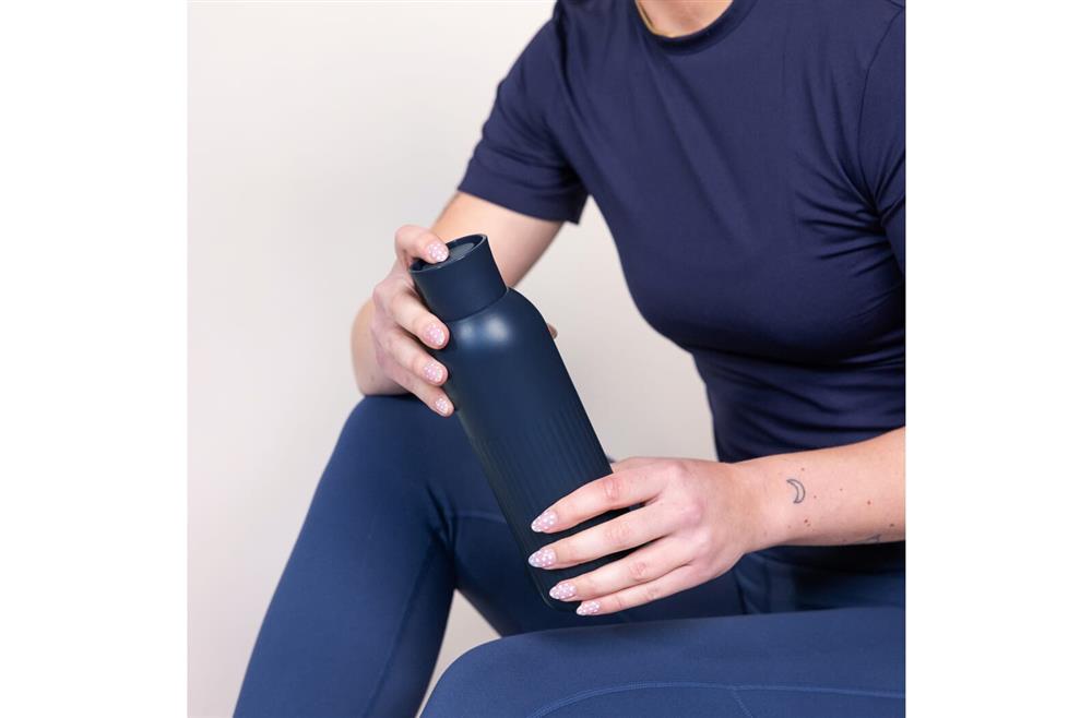 Sagaform Tekla Push: skandinavisches Design und Funktion. Aus recyceltem Stahl mit Vakuumisolierung und Kupferbeschichtung. Hält Getränke 12h heiß oder 24h kalt ohne Kondensation. Cleverer Push-Verschluss, sportlicher Look, auslaufsicher. Pulverbeschichtet, spülmaschinenfest, ideal für unterwegs.