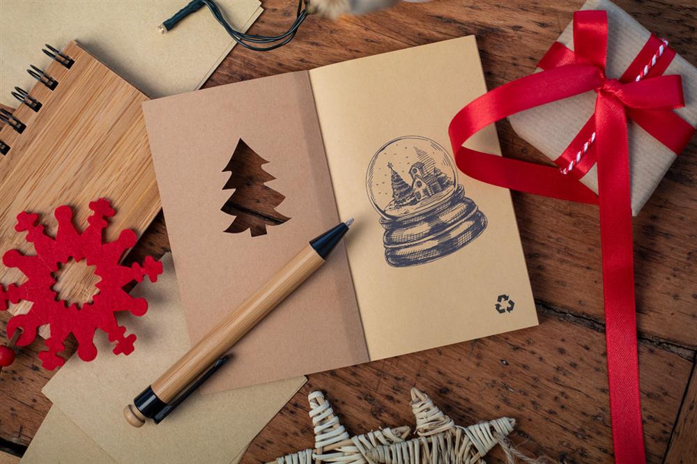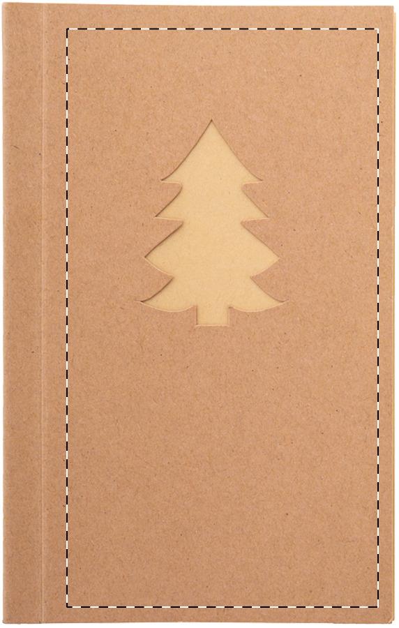 Notizbuch mit Recyclingpapiereinband, gestanztem Weihnachtsbaum auf dem Einband und 85 weißen Blättern aus recyceltem Kraftpapier.