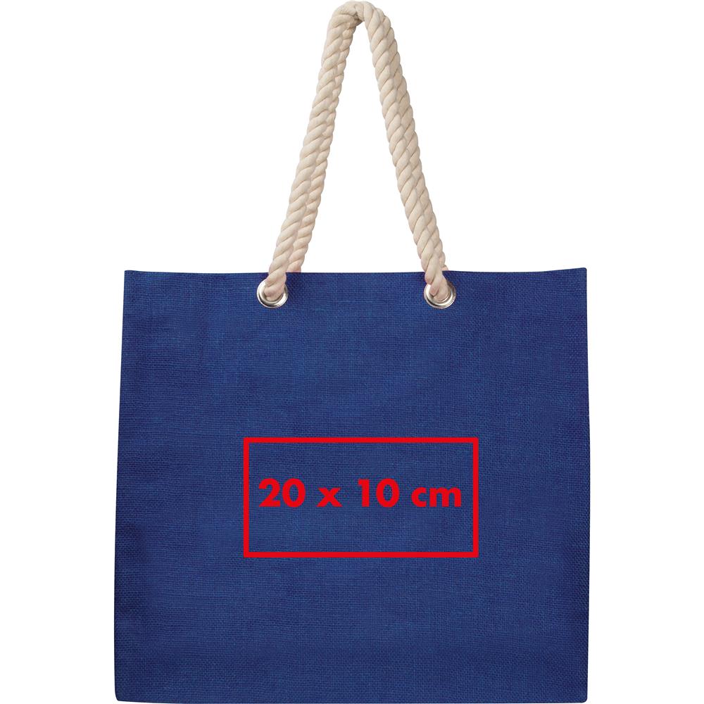 Große, farbige Jutetasche mit robusten Kordelgriffen und kleiner Geldbörse, die an der Kordel befestigt ist. Eignet sich hervorragend als Shoppingbegleiter. Die Werbung wird auf eine Seite gedruckt.