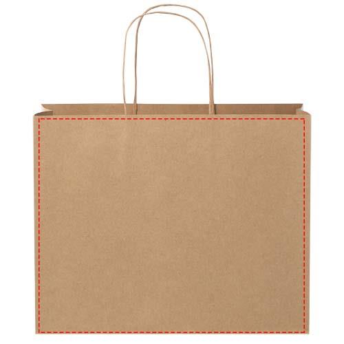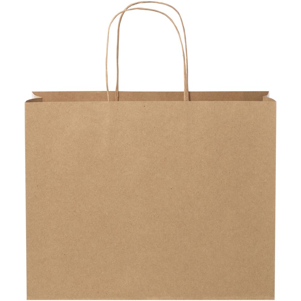 Große 120 g/m2 Kraftpapiertüte (31 × 12 × 25 cm) mit gedrehten Papiergriffen. Die personalisierbare Vorder- und Rückseite bietet viel Platz für ein Logo oder ein anderes Design und ist somit ein hervorragendes Marketinginstrument für Unternehmen. Hergestellt in Europa und zu 100 % recycelbar. Diese Tragetasche ist eine nachhaltige Wahl für umweltbewusste Unternehmen und Personen, die eine nachhaltige Verpackungslösung suchen.
