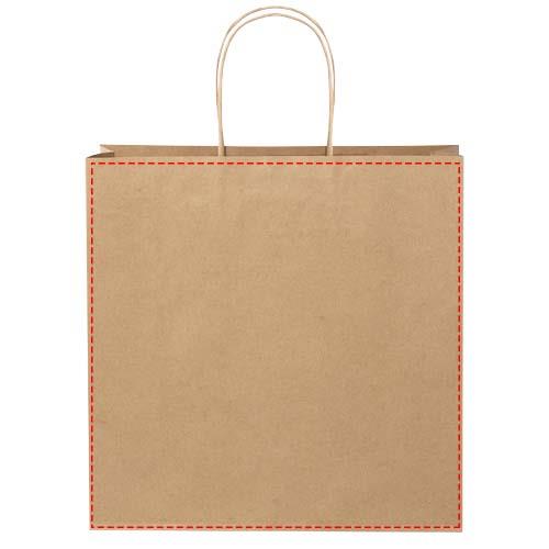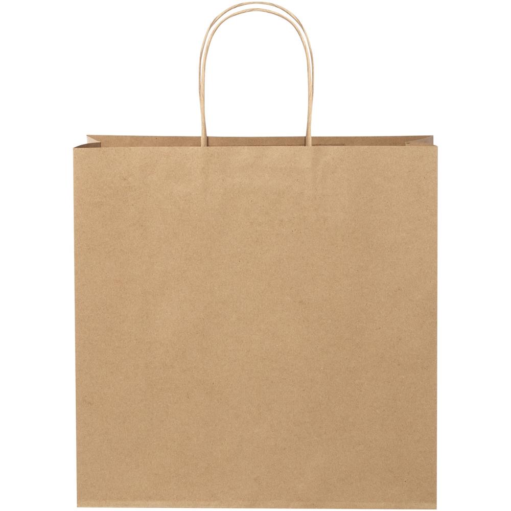 Extra große 120 g/m2 Kraftpapiertüte (31 × 12 × 31 cm) mit gedrehten Papiergriffen. Die personalisierbare Vorder- und Rückseite bietet viel Platz für ein Logo oder ein anderes Design und ist somit ein hervorragendes Marketinginstrument für Unternehmen. Hergestellt in Europa und zu 100 % recycelbar. Diese Tragetasche ist eine nachhaltige Wahl für umweltbewusste Unternehmen und Personen, die eine nachhaltige Verpackungslösung suchen.