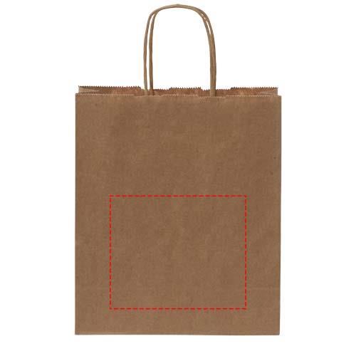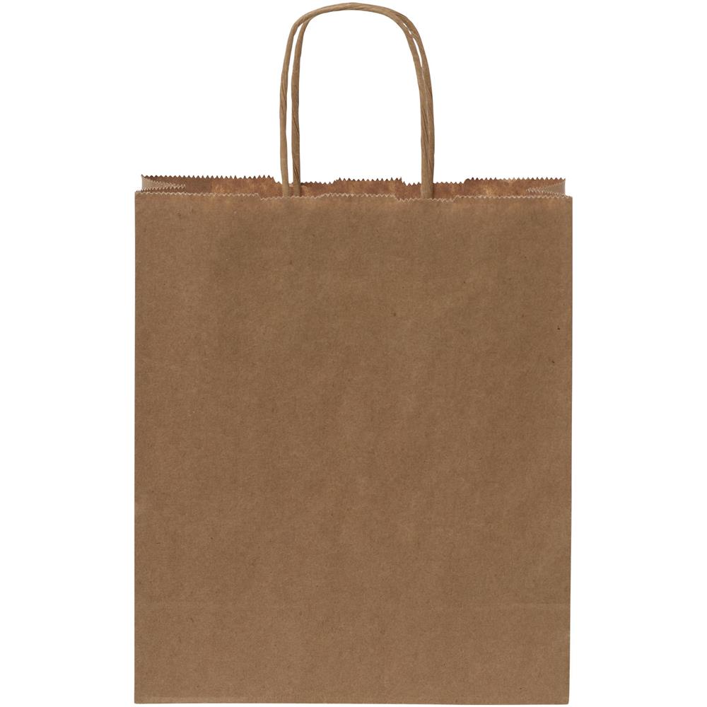 Kleine 80 g/m² Kraftpapiertasche mit gedrehten Griffen. Hergestellt in Europa aus 80 g/m2 Papier aus verantwortungsvollen Quellen, ist sie eine nachhaltige und langlebige Verpackungslösung mit ausreichend Platz für eine Vielzahl von Artikeln. Das natürliche und rustikale Aussehen des Kraftpapiers verleiht jedem Anlass eine elegante Note. Diese Tasche ist ideal für Einkäufe, Geschenke oder Veranstaltungen und eine umweltfreundliche Alternative zu Kunststofftaschen. Nutzen Sie unsere praktischen und umweltfreundlichen Kraftpapiertaschen. Größe 18 × 8 × 21 cm.