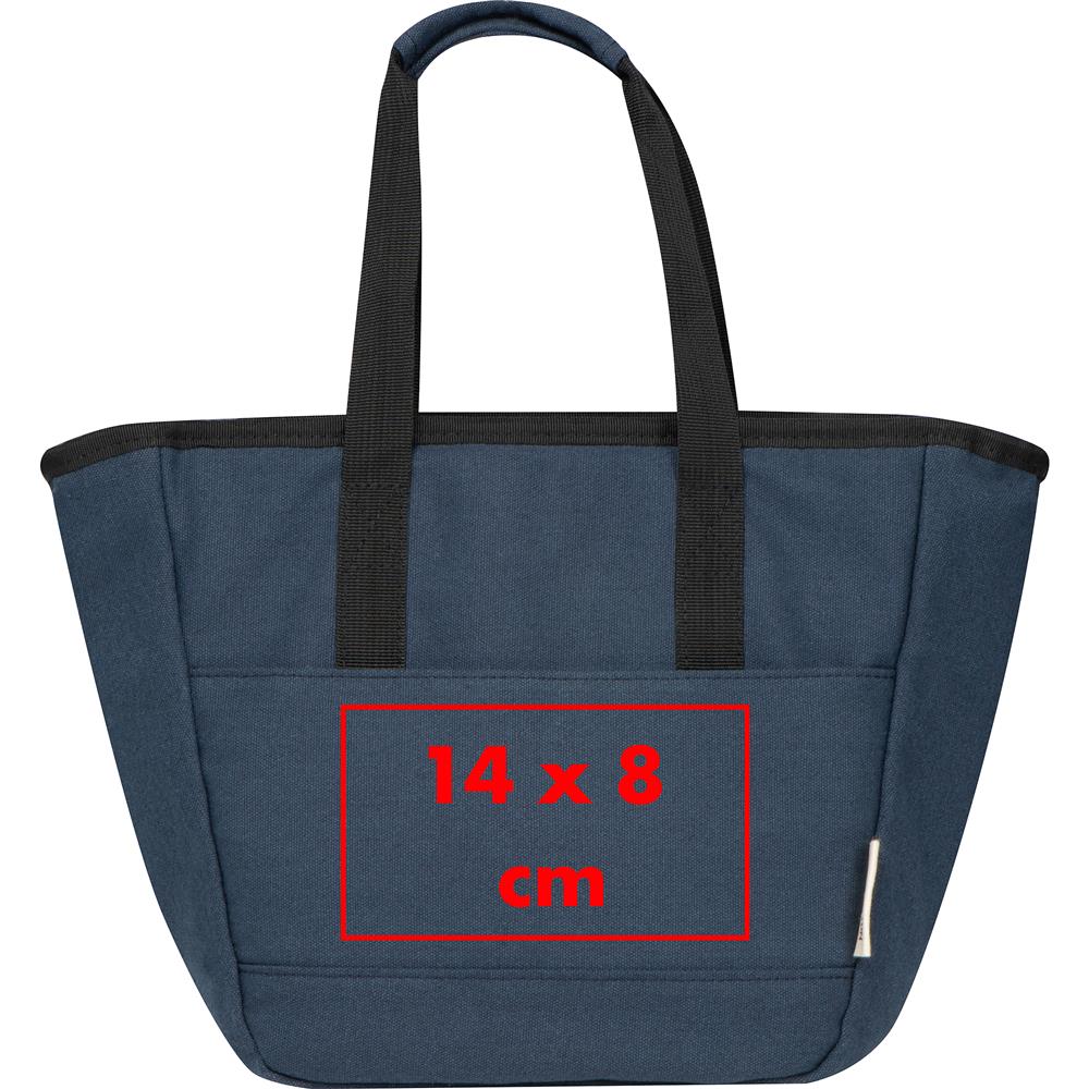 Kühltasche aus recycelter Baumwolle mit zwei Tragehenkeln, Frontfach und einer Kapazität von 10 Litern. Super geeignet als Lunchbag. Ihre Werbung drucken wir auf das Frontfach.