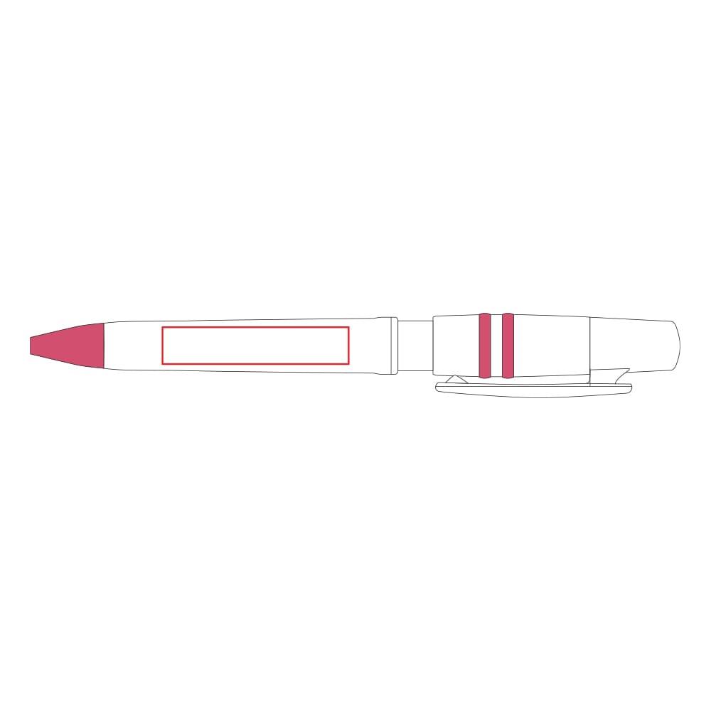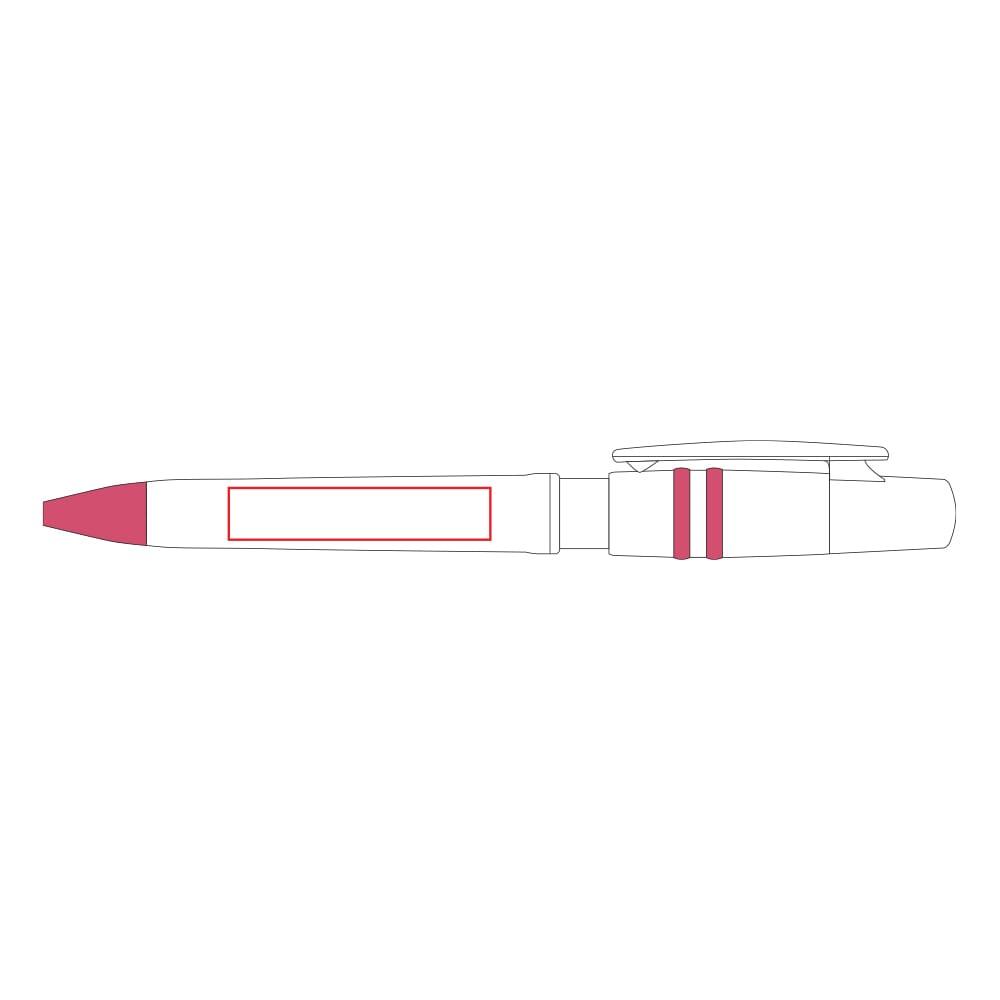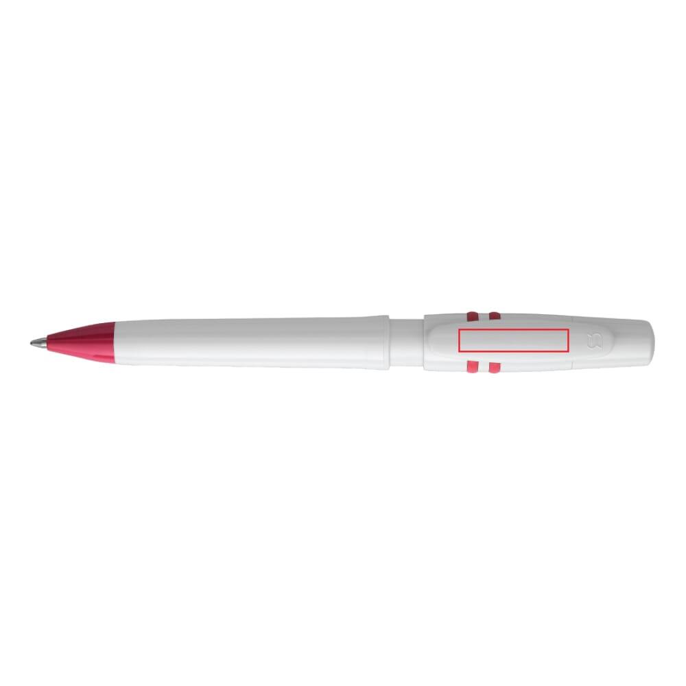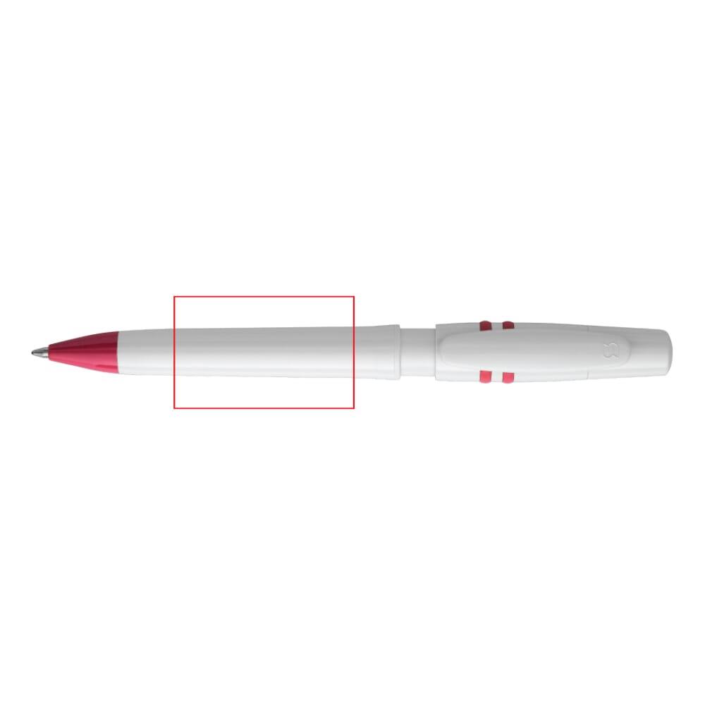 Der Hardcolour Kugelschreiber Nora mit weißem Schaft und weißem Clip. Die Ringe im Drücker sind farbig. Ausgestattet mit einer blau schreibenden Jumbo-Refill-Mine. Der Druckkugelschreiber besteht aus ABS und wird in Europa hergestellt. Ab einer Abnahmemenge von 5.000 Stück sind eigene Farbkombinationen möglich.