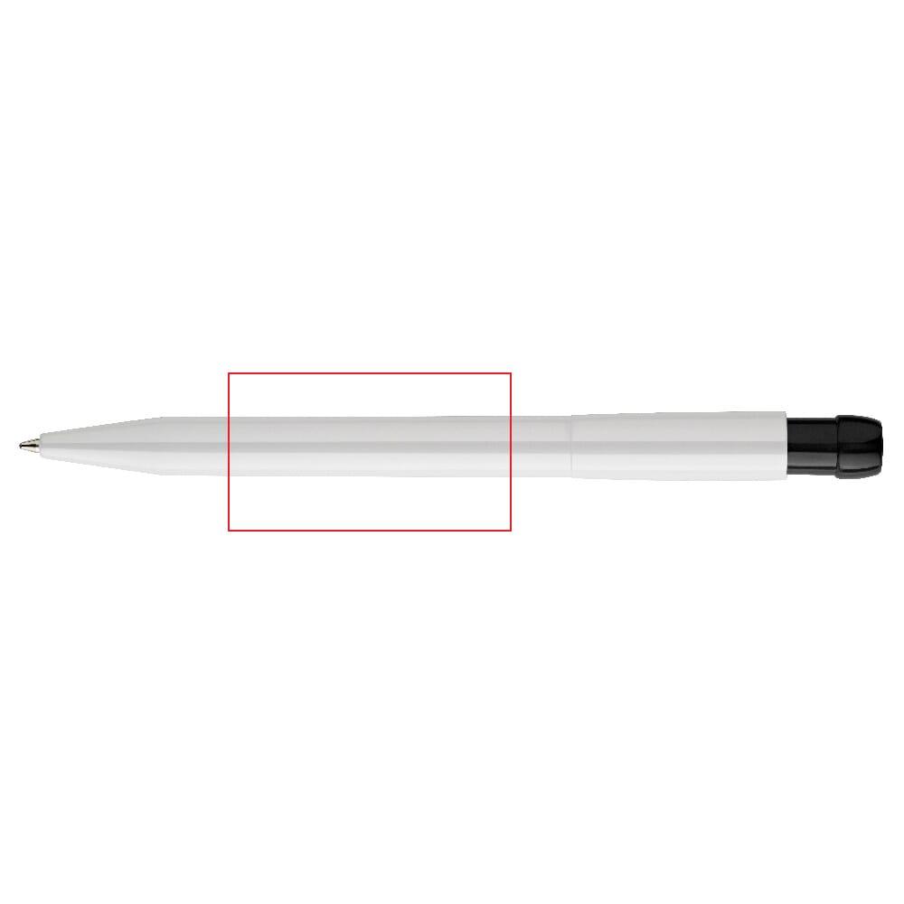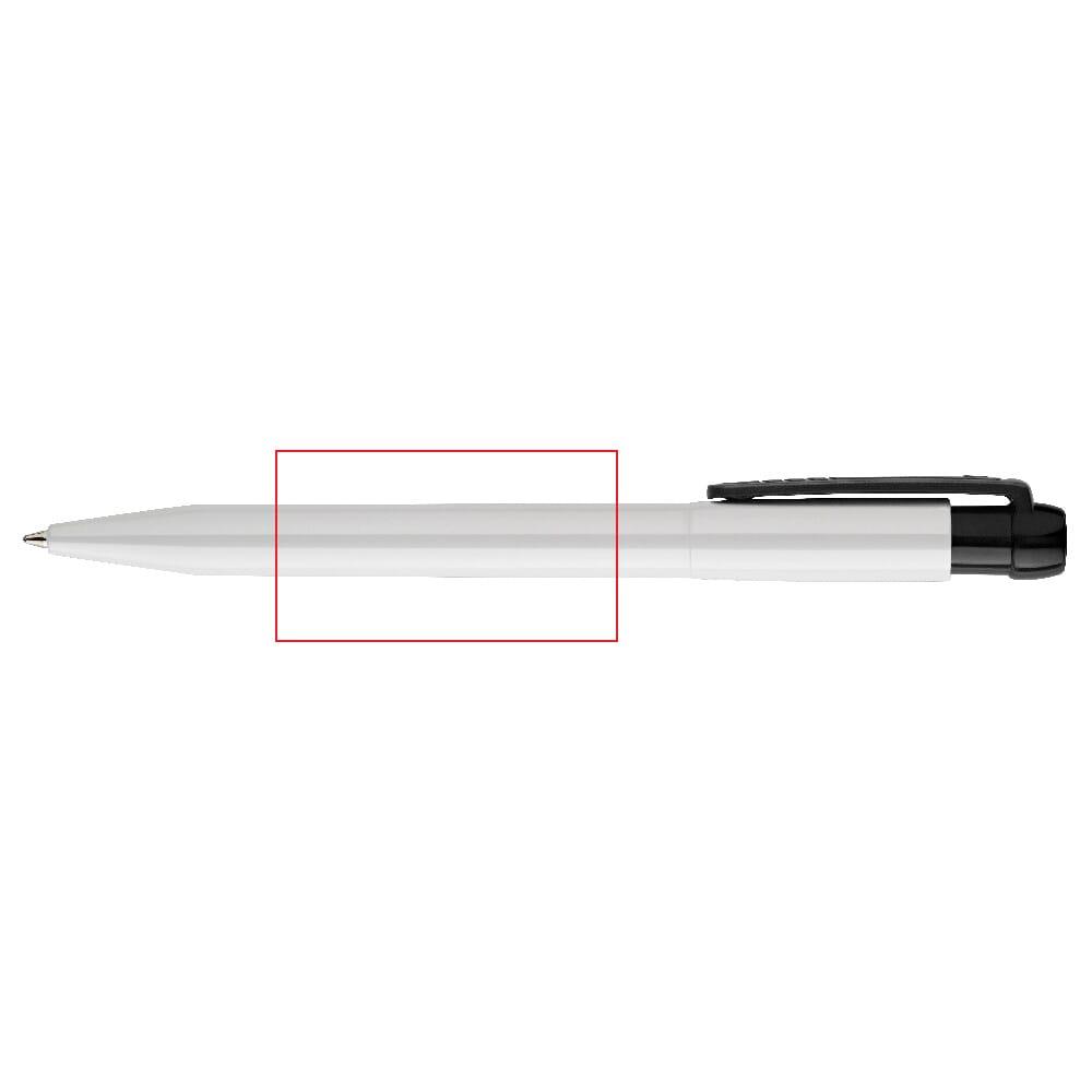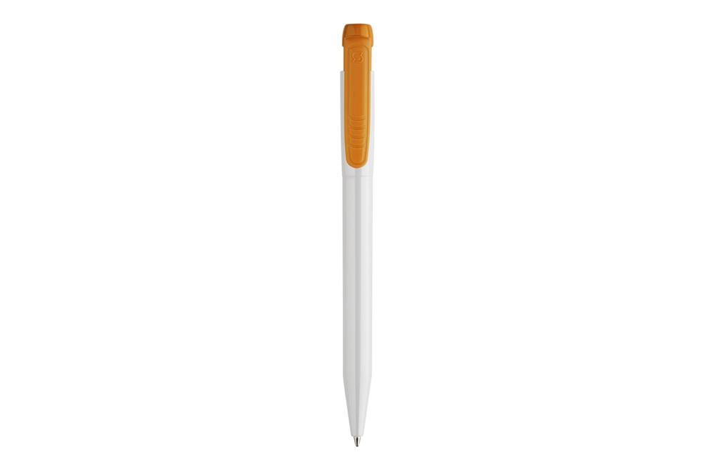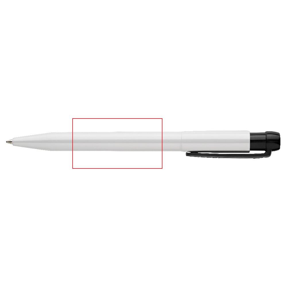 Schlanker weißer Hardcolour-Kugelschreiber mit farbigem Clip. Ein ansprechender Werbeartikel wegen seiner Druckfläche. Mit synthetischer blau schreibender X20-Refill-Mine. Druckkugelschreiber aus ABS, hergestellt in Europa. Ab einer Abnahmemenge von 5.000 Stück sind eigene Farbkombinationen möglich.
