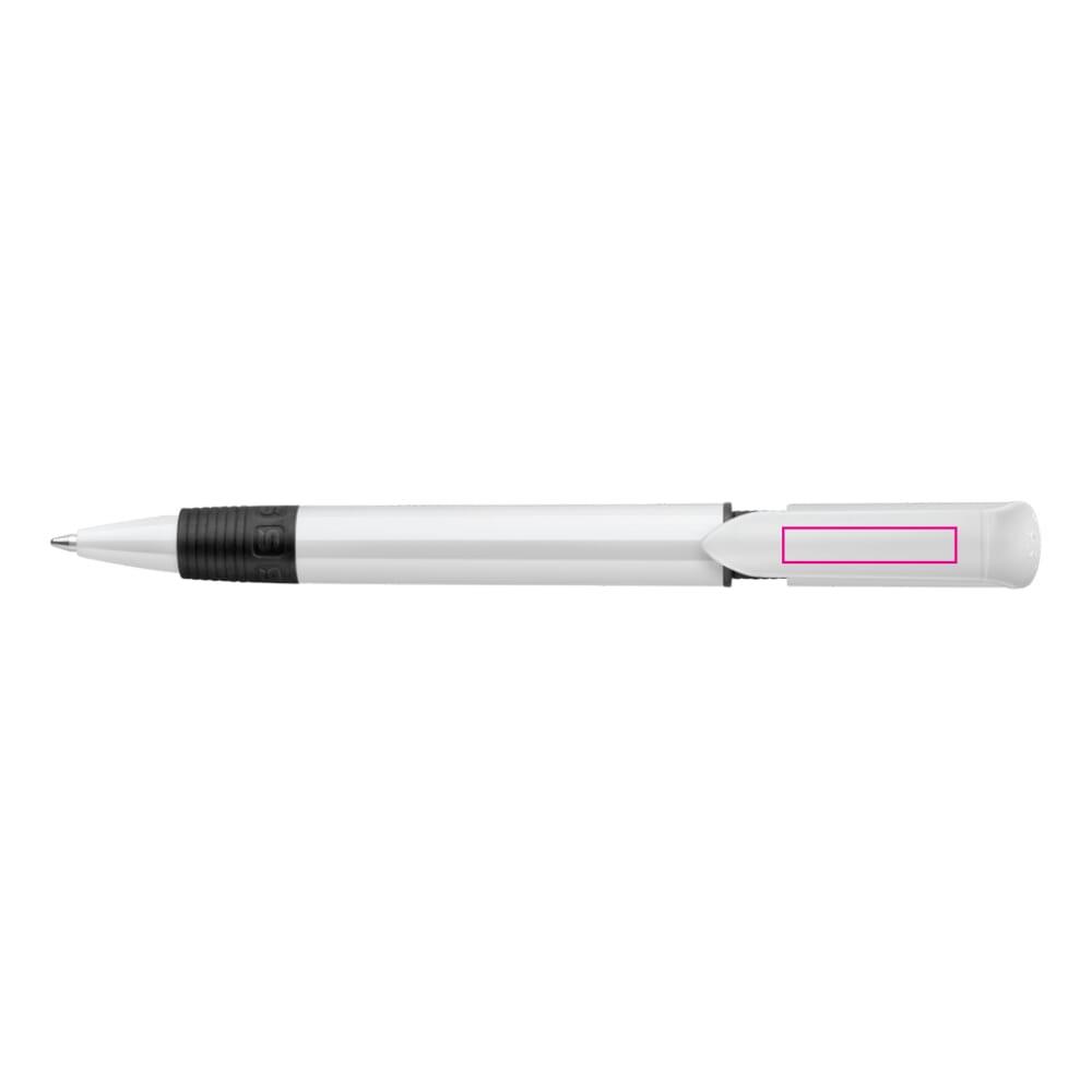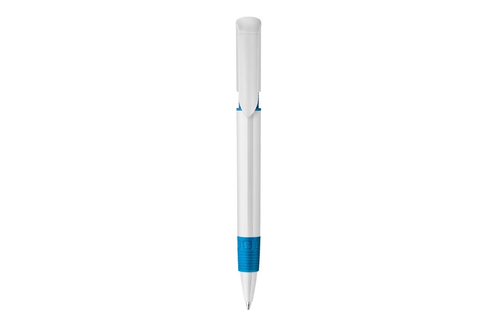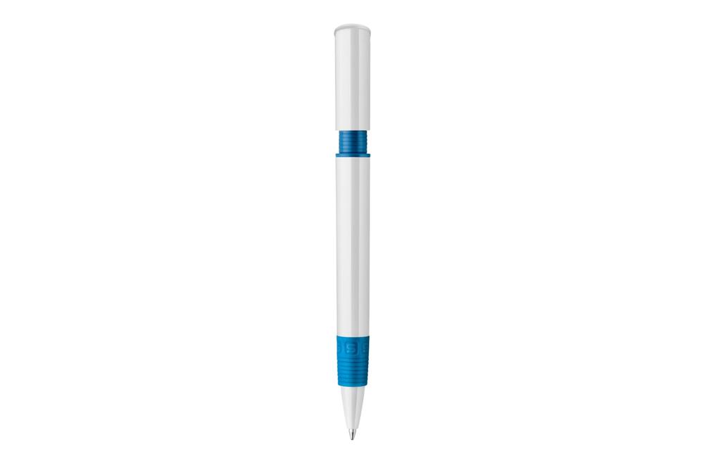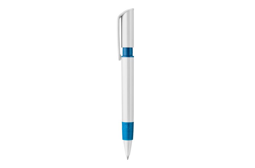 Der S40-Grip Kugelschreiber ist ein beliebtes Modell, da der farbige Teil unter dem bedruckbaren Clip dem Stift Stil und Charakter verleiht und der Griff am Stift die selbe Farbe wie der Clip hat. Der weiße Schaft wird mit einem Logodruck veredelt. Druckkugelschreiber ausgestattet mit einer blau schreibenden Toppoint jumbo-Refill-Mine. Der Hardcolour-Kugelschreiber besteht aus ABS und wird in Europa hergestellt. Ab einer Abnahmemenge von 5.000 Stück sind eigene Farbkombinationen möglich.