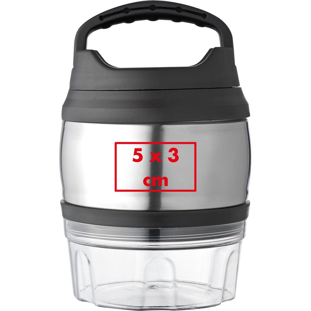 In dieser Edelstahl Lunch Box (600ml Fassungsvermögen) mit praktischem Tragehenkel lassen sich nicht nur die Speisen mühelos transportieren - sie bleiben durch die doppelwandige Isolierung auch lange warm. Das transparente Fach unten dient zur separaten Aufbewahrung weiterer Lebensmittel (320ml Fassungsvermögen). Ihre Werbung lasern wir außen auf die Edelstahlfläche.
