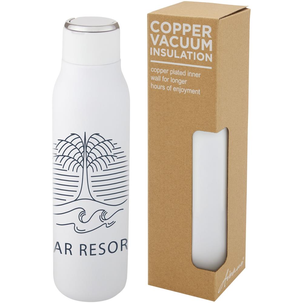 Die Marka-Flasche hat eine Vakuumkonstruktion aus Edelstahl mit Kupferisolierung, die Getränke mehrere Stunden lang heiß oder kalt hält. Die isolierte Konstruktion aus 18/8-Edelstahl verhindert die Bildung von Kondenswasser an der Außenseite der Flasche, und die trendige Pulverbeschichtung macht sie besonders haltbar. Außerdem verfügt sie über einen schraubbaren, auslaufsicheren Deckel und eine haltbare Handschlaufe aus Zinklegierung. BPA-frei, geprüft und zugelassen nach dem deutschen Lebensmittelrecht (LFGB). Auf Phthalate geprüft und zugelassen gemäß den REACH-Vorschriften. Passend für die meisten gängigen Auto-Getränkehalterungen. Das Fassungsvermögen beträgt 600 ml. Handwäsche empfohlen. Verpackt in einer Geschenkbox aus Recyclingkarton.