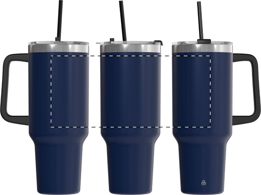 Doppelwandiger, vakuumisolierter Thermobecher aus recyceltem Edelstahl mit PS-Trinkdeckel und PP-Strohhalm. Füllmenge: 1200 ml.