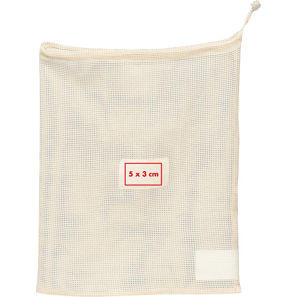 Waschbares Mehrwegnetz aus Baumwolle für Obst, Gemüse und mehr. Mit Kordel zum Verschließen und kleinem Feld aus Baumwolle auf der Vorderseite für Ihren Werbeaufdruck.