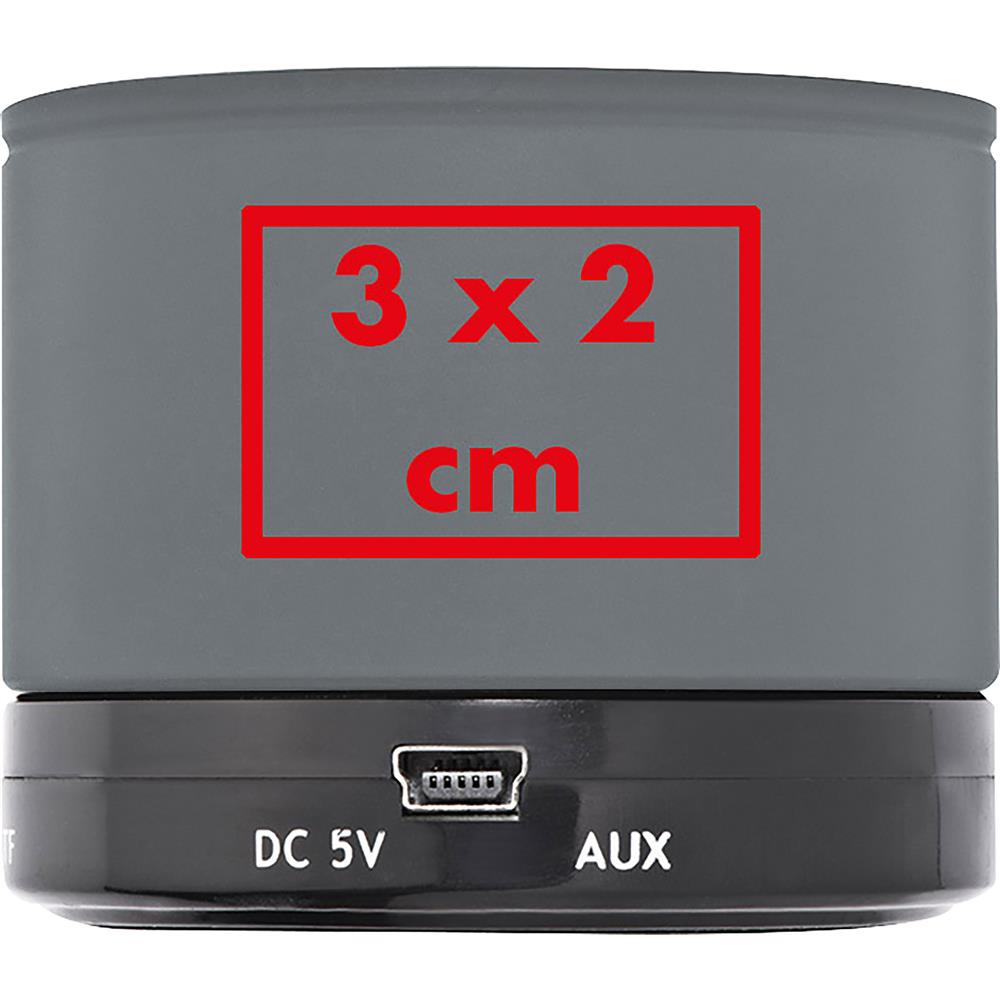 Mini Bluetooth Lautsprecher (Version 5.0) mit USB Anschluss zum Aufladen, einer Reichweite bis zu 10 Metern, Ladezeit ca. 2h und einer Laufzeit von bis zu 1,5 Stunden. Ihre Werbung wird auf den Lautsprecher gelasert.