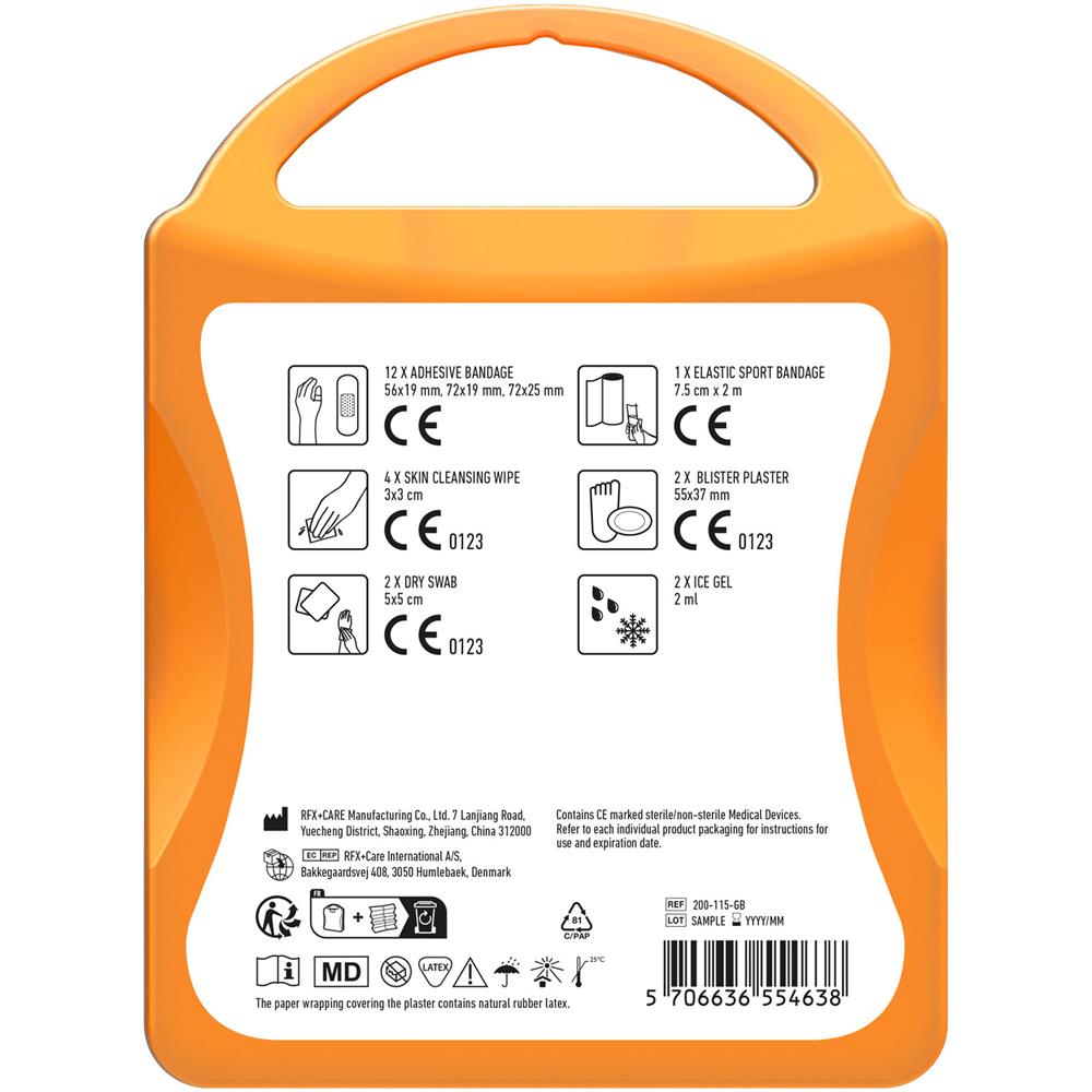 Ideales Erste-Hilfe Set für jeden Sportler. Dieses Set hilft Ihnen bei kleinen Verletzungen und Unfällen. Inhalt: 12 wasserfeste Pflaster, 4 hautreinigende Tupfer, 2 Trockentupfer, 2 Eisgel, 2 Blasenpflaster, 1 elastischer Sportverband. Alle im Set enthaltenen Erste-Hilfe- und Pflegeprodukte erfüllen alle geltenden EU-Vorschriften. Preis inkl. vollfarbigem Druck.