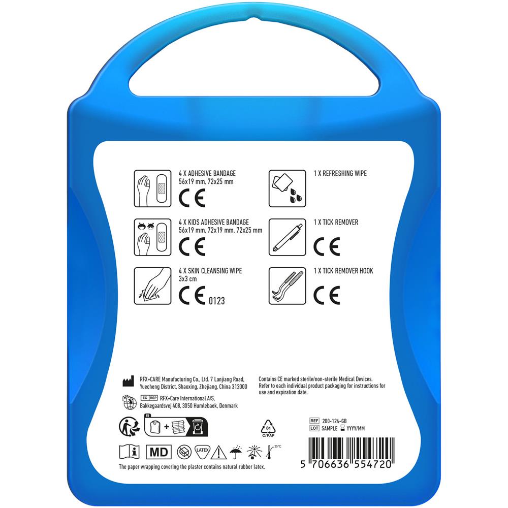 Ideales Set um Zecken zu entfernen und die Stiche zu behandeln. Inhalt: 4 wasserfeste Pflaster, 4 hautreinigende Tupfer, 1 Zeckenentferner blau (Menschen), 1 Zeckenzange (orange), 4 Kinderpflaster, 1 Reinigungstuch. Alle im Set enthaltenen Erste-Hilfe- und Pflegeprodukte erfüllen alle geltenden EU-Vorschriften. Preis inkl. vollfarbigem Druck.
