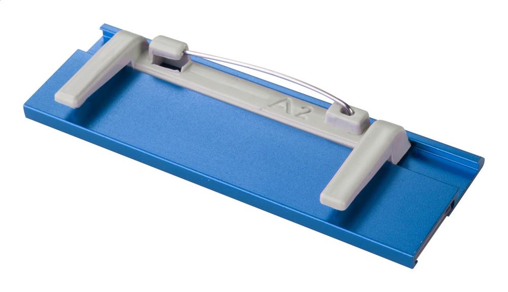 Namenschild aus Aluminium mit austauschbarem Papiereinleger und Befestigung aus Kunststoff.