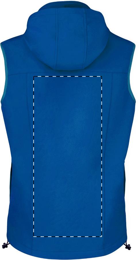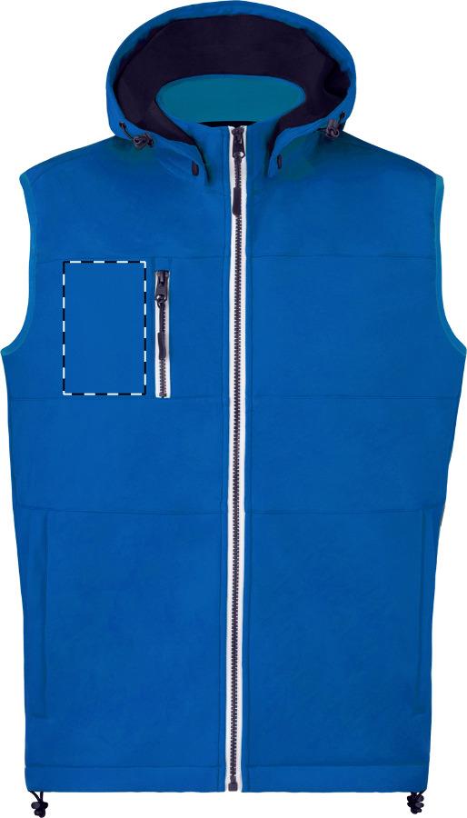 Wind- und wasserfeste Softshell-Bodywarmer/Weste mit Reißverschluss, 2 Seitentaschen, 1 Vordertasche, Stehkragen und abnehbarer Kapuze. Material: 100% Polyester, 300g/m².