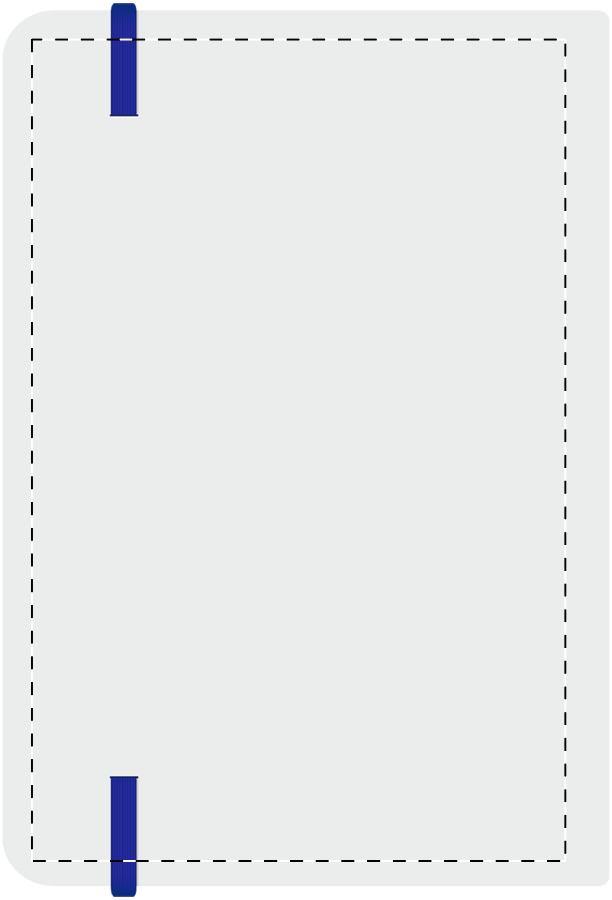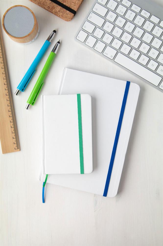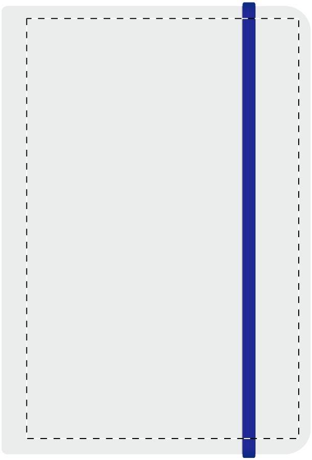 A5 Notizbuch, 100 Seiten (blanko), farbigem Gummiband und farblich abestimmten Blattrand.