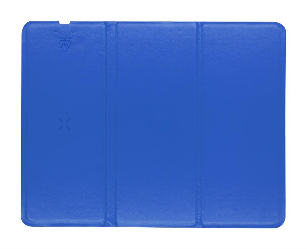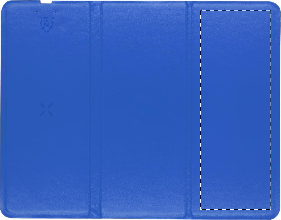 Faltbares Mauspad aus recyceltem PU-Leder mit eingebautem Wireless-Charger (10 W) und Handyhalter. Mit rutschfester Samtunterseite. Inklusive USB-Ladekabel.