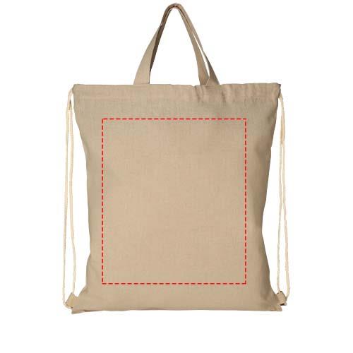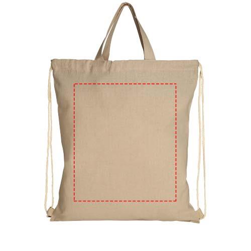 Rucksack aus 210 g/m² recycelter Baumwolle und recyceltem Polyester. Recycelte Baumwolle wird aus Verbrauchsabfällen hergestellt, die während des Schneidevorgangs in Textilfabriken anfallen. Großes Hauptfach mit Kordelzugverschluss aus Baumwolle. Ausgestattet mit zwei Griffen mit einer Höhe von 14 cm. Beständigkeit bis zu 5 kg Gewicht. Aufgrund des Produktionsprozesses kann es zu geringfügigen Farbabweichungen des Produktes kommen.