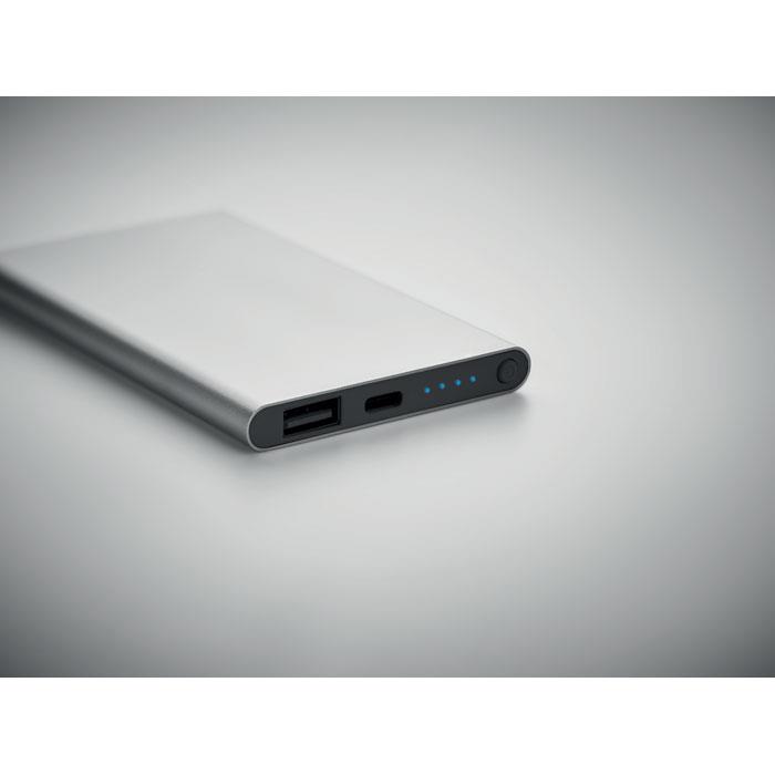 Powerbank 4000 mAh. Gehäuse aus recyceltem Aluminium. Ausgangsstrom DC5V/2A. Inklusive Kontrollleuchte und USB-Kabel mit Typ-C. Eingang/Ausgang: Typ- C.