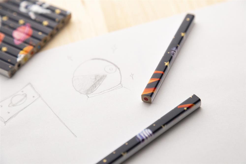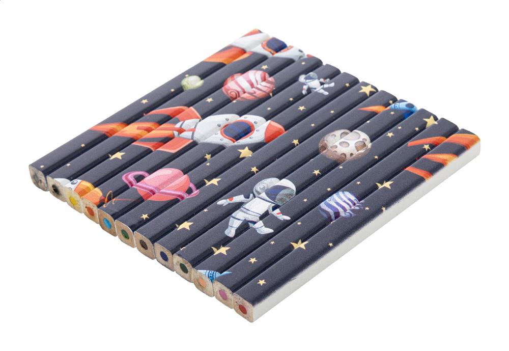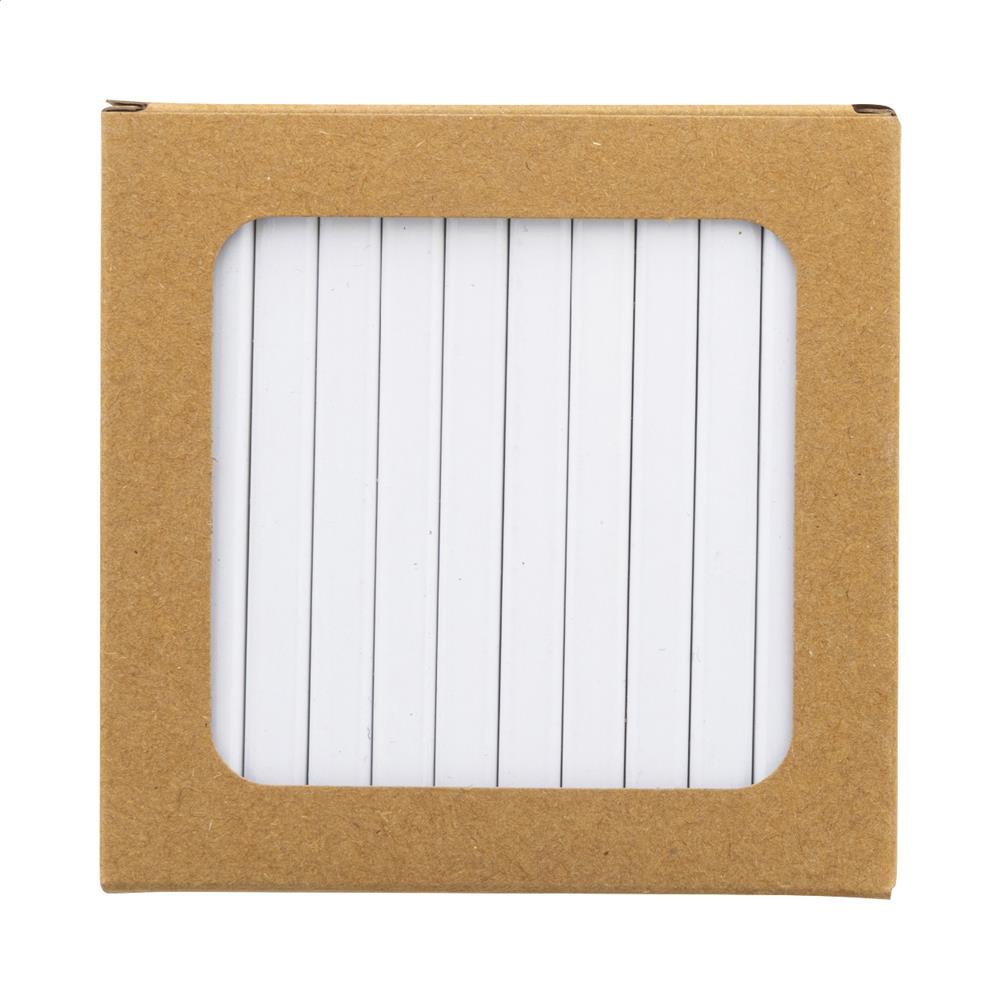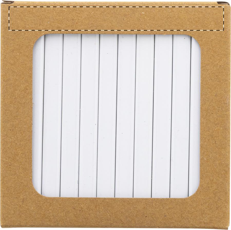 12-teiliges Holz-Buntstiftset, rechteckig, mit weißer Oberfläche. In einer Kraftpapierbox mit großem Fenster. Ideal für vollflächigen UV-LED-Druck.