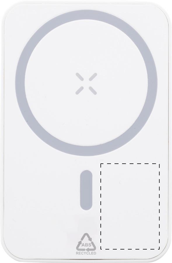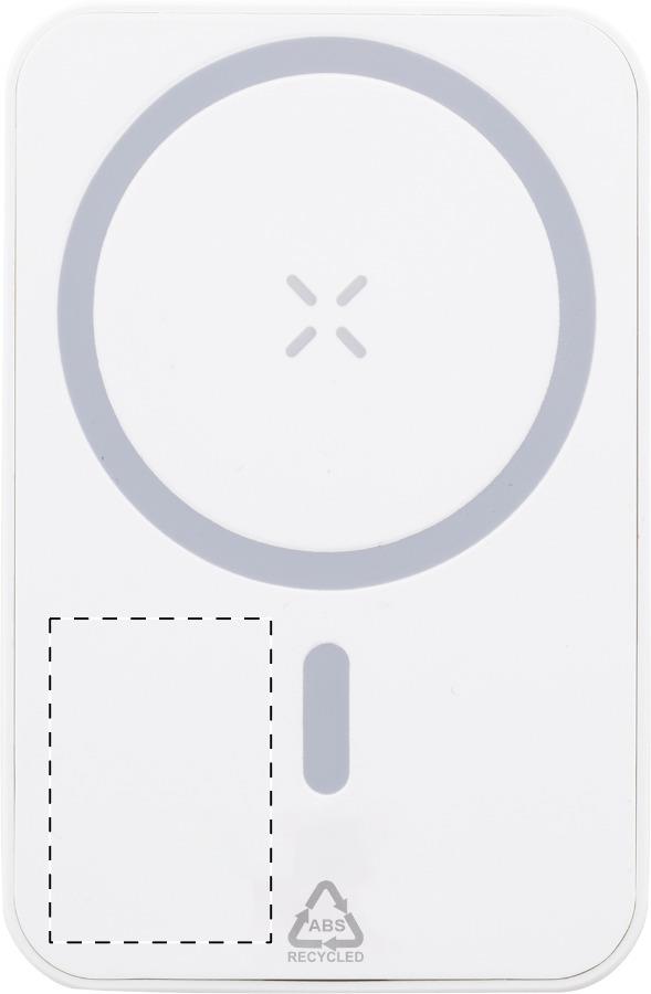 Powerbank recyceltem ABS mit 5000-mAh-Akku und integriertem magnetischen Wireless-Charger (5 W). Mit USB-C-Eingang und Ladeanschluss. Inklusive selbstklebendem Metallring zur Nutzung der Magnetfunktion an jedem kabellos aufladbaren Gerät. Kompatibel mit iPhone® 12 oder neuer. Inkl. USB-Ladekabel.