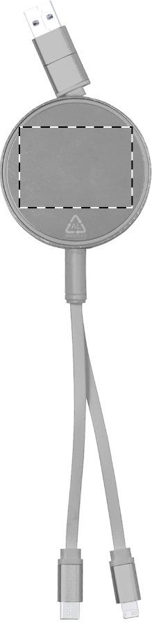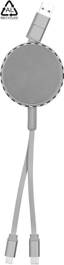Ausziehbares USB-Ladekabel aus recyceltem Aluminium mit Mikro-USB, USB-C und Lightning Steckern sowie USB und USB-C Buchsen.