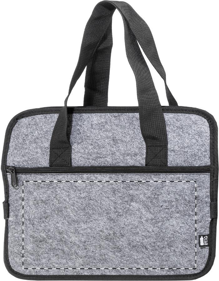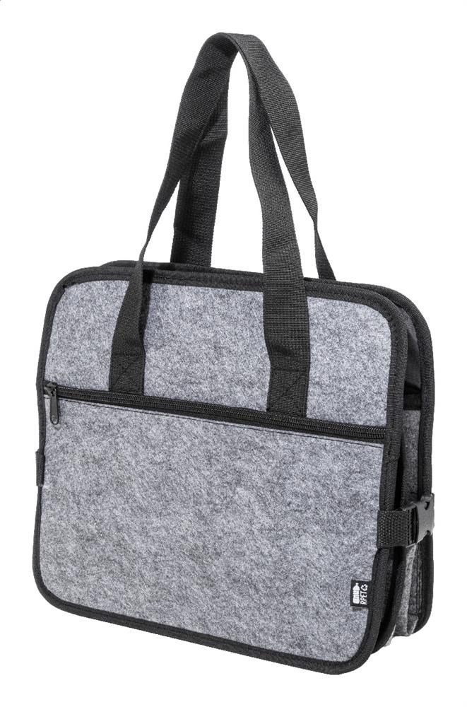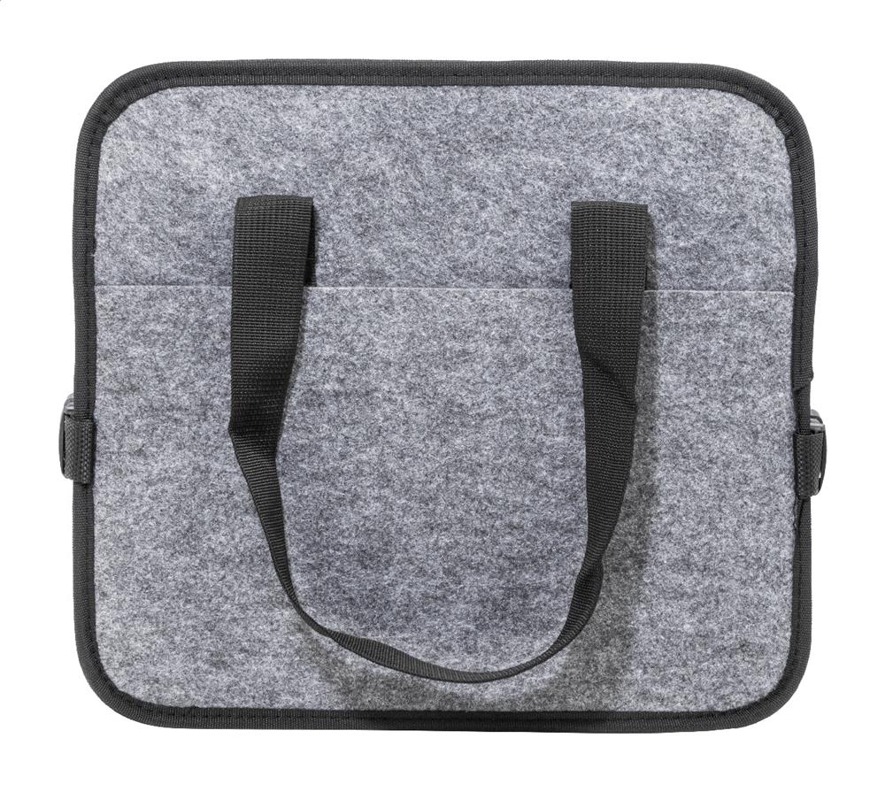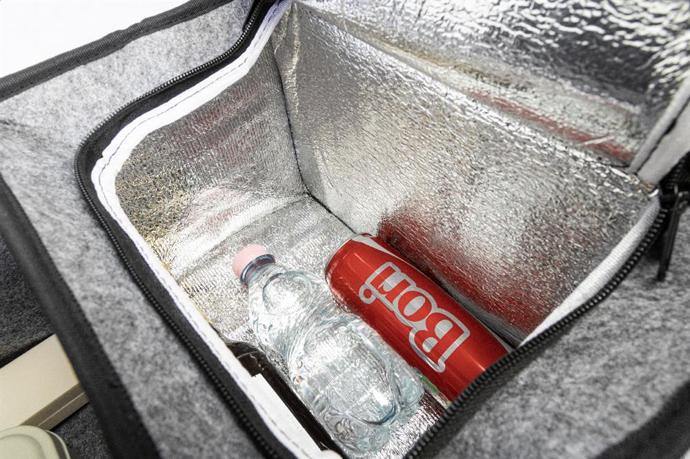 Faltbarer Kofferraumorganizer aus RPET-Filz mit Reißverschluss-Fronttasche, langen Griffen und seitlichen Schnallen für bequeme Aufbewahrung. Mit einem offenen Staufach und einem Kühlfach mit Reißverschluss und Aluminiumisolierung. Mit RPET-Label.